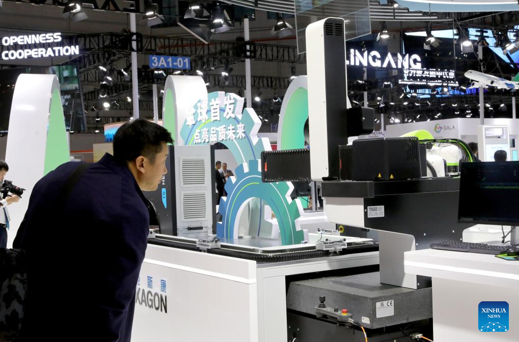 SHANGHAI, 6 noviembre, 2024 (Xinhua) -- Un visitante se informa sobre la solución de detección de defectos de superficie altamente reflectante en el estand de Hexagon durante la VII Exposición Internacional de Importaciones de China (CIIE, por sus siglas en inglés), en Shanghai, en el este de China, el 6 de noviembre de 2024. Durante la VII CIIE en curso, muchas nuevas tecnologías, logros y productos se presentaron al público por primera vez. (Xinhua/Fang Zhe)