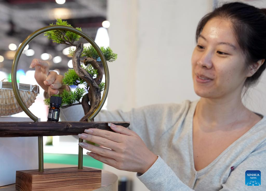 SHANGHAI, 6 noviembre, 2024 (Xinhua) -- Imagen del 5 de noviembre de 2024 de una trabajadora mostrando el aceite esencial de aromaterapia de ginseng durante la VII Exposición Internacional de Importaciones de China (CIIE, por sus siglas en inglés), en Shanghai, en el este de China. Durante la VII CIIE en curso, muchas nuevas tecnologías, logros y productos se presentaron al público por primera vez. (Xinhua/Liu Ying)