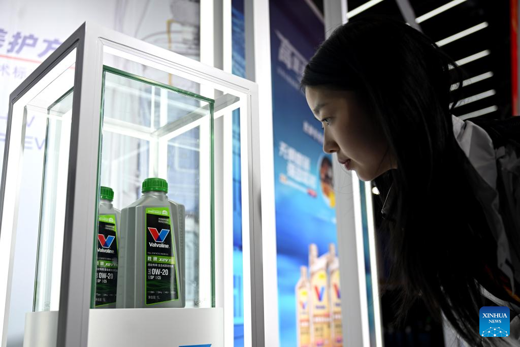 SHANGHAI, 6 noviembre, 2024 (Xinhua) -- Una visitante observa aceite de motor totalmente sintético durante la VII Exposición Internacional de Importaciones de China (CIIE, por sus siglas en inglés), en Shanghai, en el este de China, el 6 de noviembre de 2024. Durante la VII CIIE en curso, muchas nuevas tecnologías, logros y productos se presentaron al público por primera vez. (Xinhua/Chen Haoming)