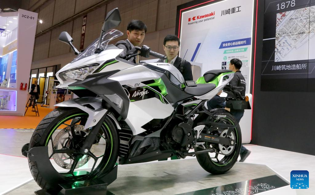 SHANGHAI, 6 noviembre, 2024 (Xinhua) -- Un expositor (i) de Kawasaki presenta una motocicleta eléctrica a un visitante durante la VII Exposición Internacional de Importaciones de China (CIIE, por sus siglas en inglés), en Shanghai, en el este de China, el 6 de noviembre de 2024. Durante la VII CIIE en curso, muchas nuevas tecnologías, logros y productos se presentaron al público por primera vez. (Xinhua/Fang Zhe)