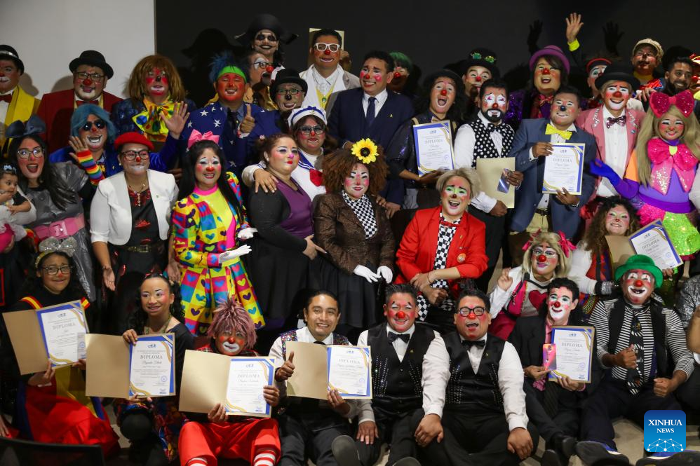 SAN SALVADOR, 6 noviembre, 2024 (Xinhua) -- Imagen del 5 de noviembre de 2024 de payasos sosteniendo sus diplomas durante una graduación de payasos del Centro de Estudios Artísticos llevada a cabo en el marco de la conmemoración del Día Internacional del Payaso, en la Biblioteca Nacional de El Salvador, en el departamento de San Salvador, El Salvador. (Xinhua/Alexander Peña)