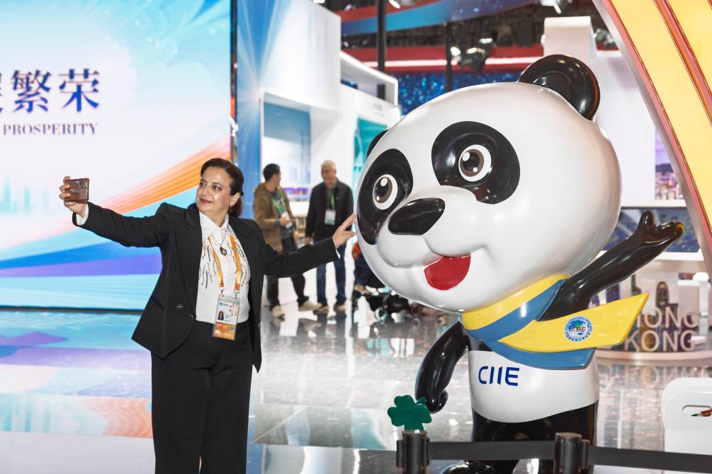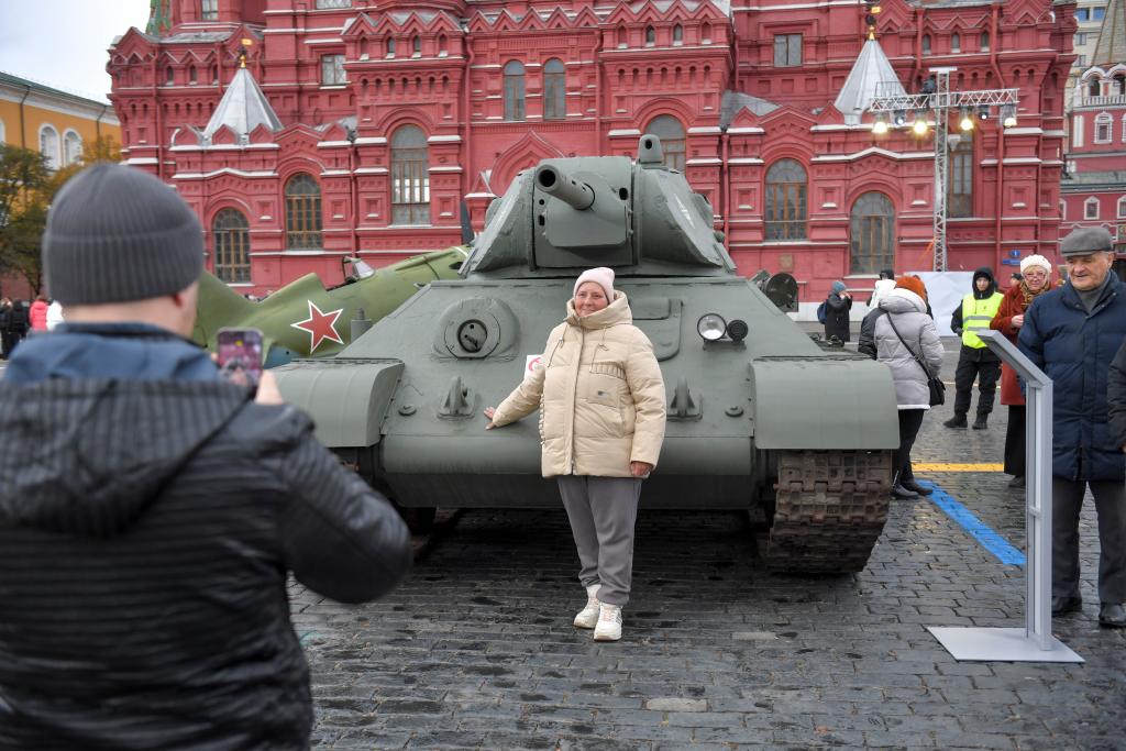 MOSCU, 7 noviembre, 2024 (Xinhua) -- Una mujer posa para fotografías en una exhibición al aire libre para conmemorar el desfile militar de 1941 en la Plaza Roja, en Moscú, Rusia, el 7 de noviembre de 2024. (Xinhua/Alexander Zemlianichenko Jr)
