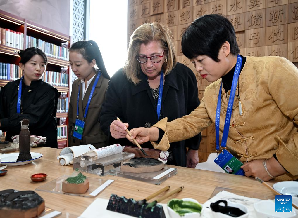 BEIJING, 7 noviembre, 2024 (Xinhua) -- Una visitante extranjera (2-d) experimenta la impresión con bloques de madera durante una exhibición sobre logros de estudios clásicos, en Beijing, capital de China, el 7 de noviembre de 2024. La exhibición abrió aquí el jueves, como una de las actividades auxiliares de la Conferencia Mundial de Clásicos programada del 6 al 8 de noviembre en Beijing. (Xinhua/Li He)