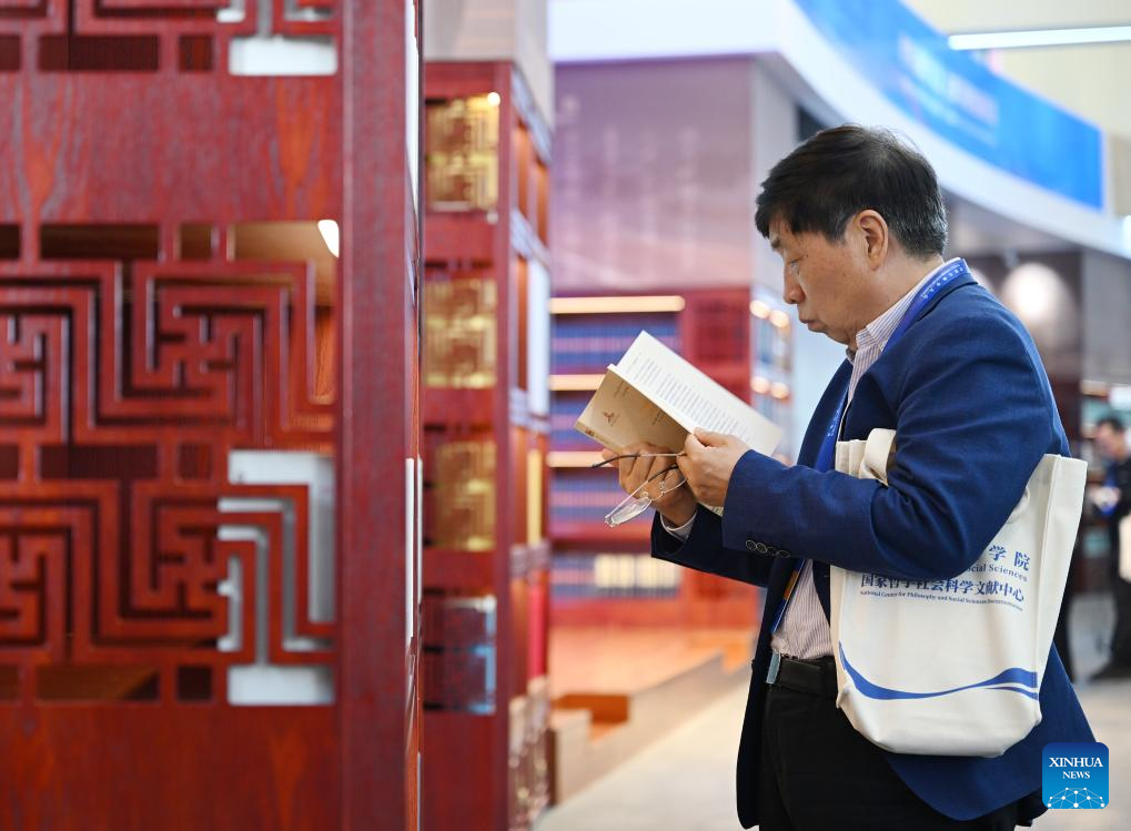 BEIJING, 7 noviembre, 2024 (Xinhua) -- Un visitante lee libros durante una exhibición sobre logros de estudios clásicos, en Beijing, capital de China, el 7 de noviembre de 2024. La exhibición abrió aquí el jueves, como una de las actividades auxiliares de la Conferencia Mundial de Clásicos programada del 6 al 8 de noviembre en Beijing. (Xinhua/Li He)