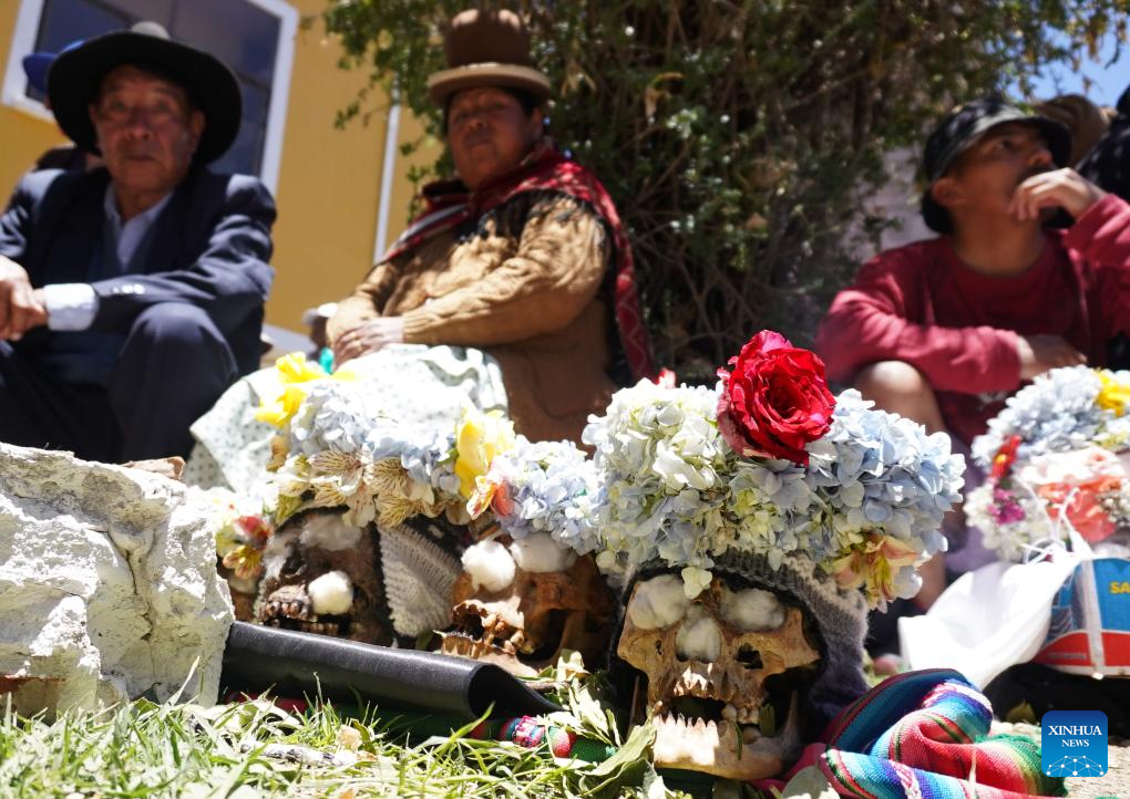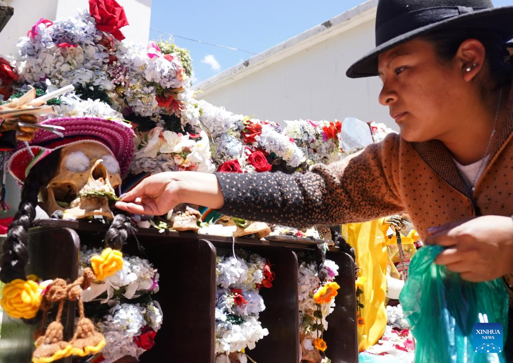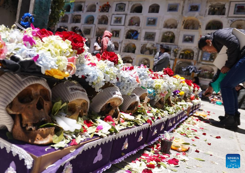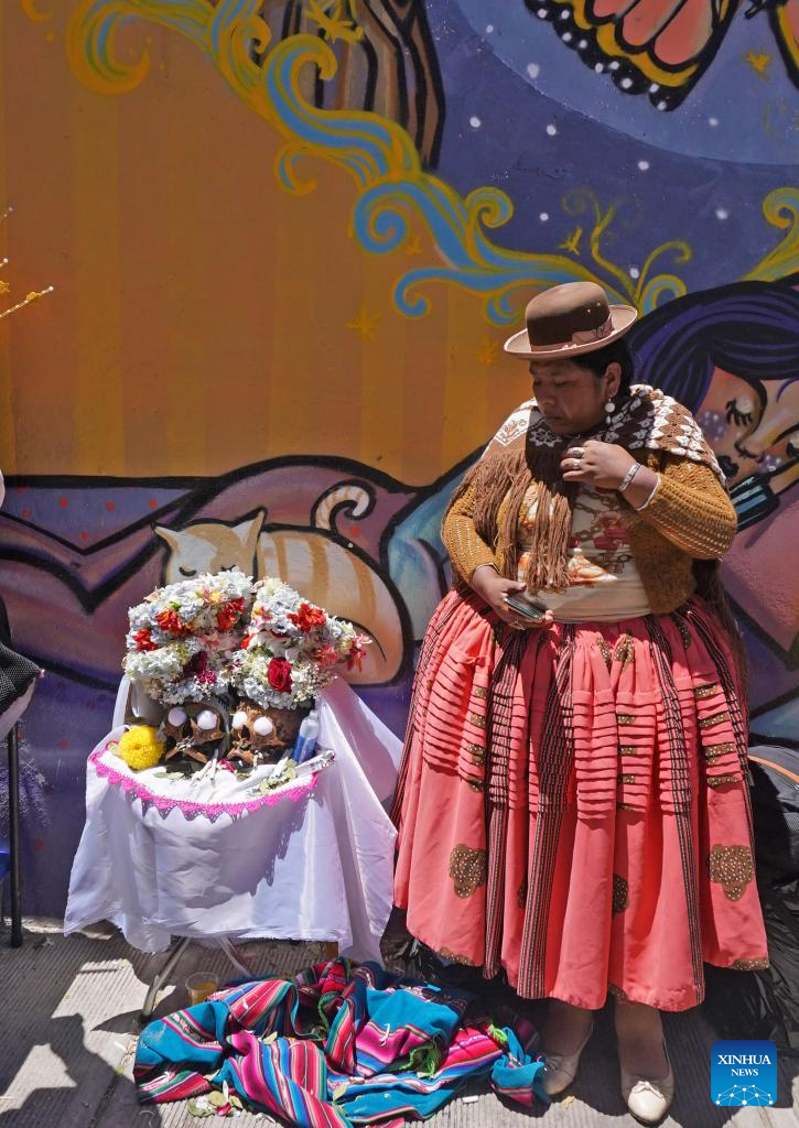 LA PAZ, 8 noviembre, 2024 (Xinhua) -- Una mujer aymara exhibe cráneos durante la celebración de la festividad de las "Ñatitas", en el Cementerio General, en la ciudad de La Paz, Bolivia, el 8 de noviembre de 2024. (Xinhua/Javier Mamani)