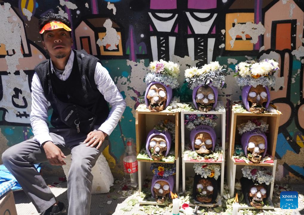 LA PAZ, 8 noviembre, 2024 (Xinhua) -- Un joven cuida cráneos durante la celebración de la festividad de las "Ñatitas", en el Cementerio General, en la ciudad de La Paz, Bolivia, el 8 de noviembre de 2024. (Xinhua/Javier Mamani)