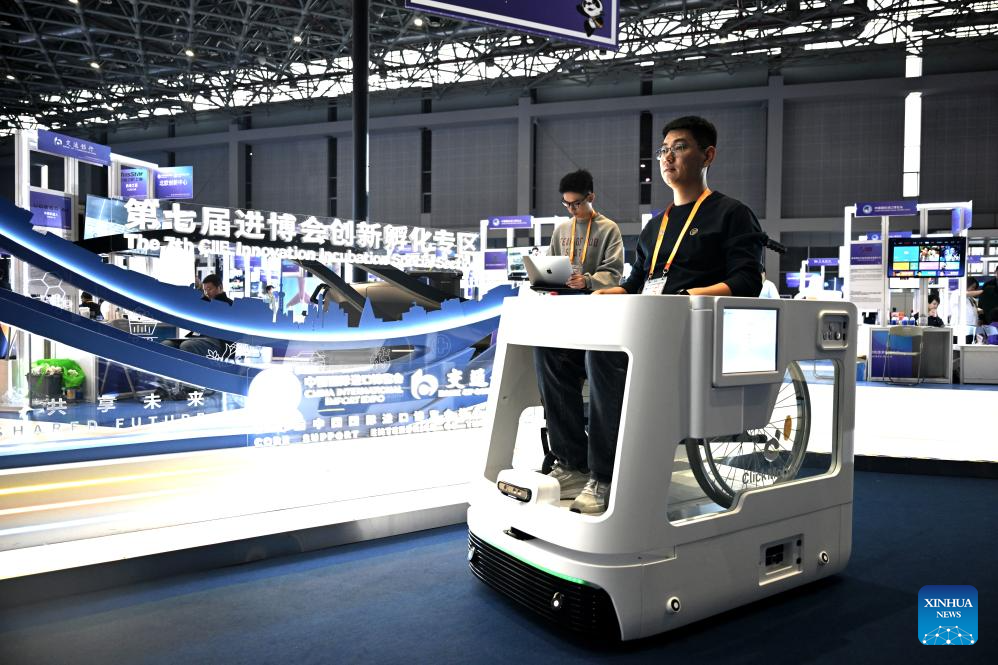 SHANGHAI, 9 noviembre, 2024 (Xinhua) -- Expositores demuestran un robot móvil para ayudar a personas paralizadas en la Sección Especial de Incubación durante la VII Exposición Internacional de Importaciones de China (CIIE, por sus siglas en inglés), en Shanghai, en el este de China, el 9 de noviembre de 2024. Con el tema "Cruzando Fronteras, Incubando Fuerzas Innovadoras y Liderando Tecnologías Futuras", la Sección Especial de Incubación de la VII CIIE tiene como objetivo ofrecer a las incubadoras tecnológicas una oportunidad para explorar conjuntamente formas de innovación. (Xinhua/Chen Haoming)