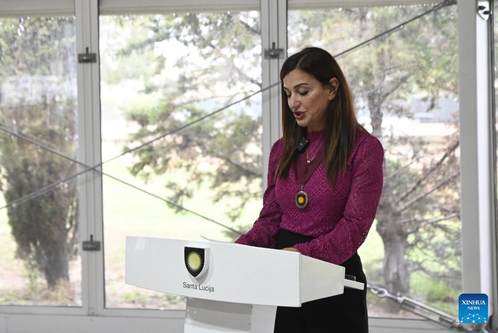 LA VALETTA, 10 noviembre, 2024 (Xinhua) -- Imagen del 9 de noviembre de 2024 de la alcaldesa de Santa Lucija, Charmaine St. John, hablando durante el lanzamiento de la iniciativa "¡Nihao! China" para la promoción cultural y turística china, en Santa Lucija, Malta. Tres autobuses eléctricos de fabricación china, cada uno adornado con imágenes vibrantes de paisajes icónicos y sitios patrimonio cultural chinos, comenzaron a operar en toda Malta el sábado. (Xinhua/Jonathan Borg)