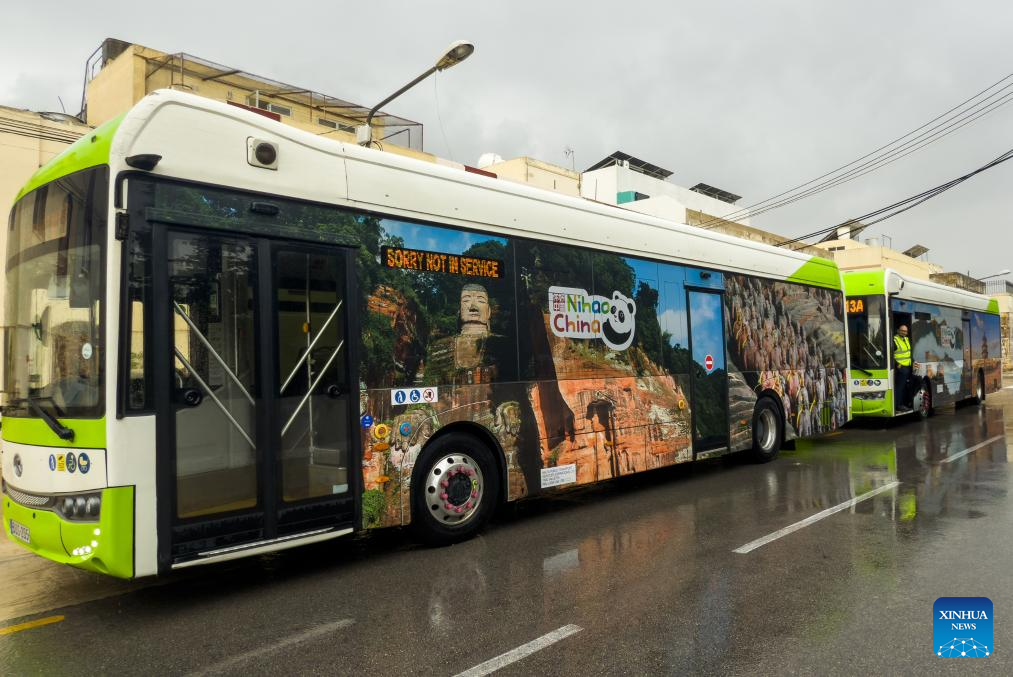 LA VALETTA, 10 noviembre, 2024 (Xinhua) -- Imagen del 9 de noviembre de 2024 de autobuses eléctricos de fabricación china adornados con imágenes de paisajes icónicos y sitios patrimonio cultural chinos, en Santa Lucija, Malta. Tres autobuses eléctricos de fabricación china, cada uno adornado con imágenes vibrantes de paisajes icónicos y sitios patrimonio cultural chinos, comenzaron a operar en toda Malta el sábado. (Xinhua/Jonathan Borg)