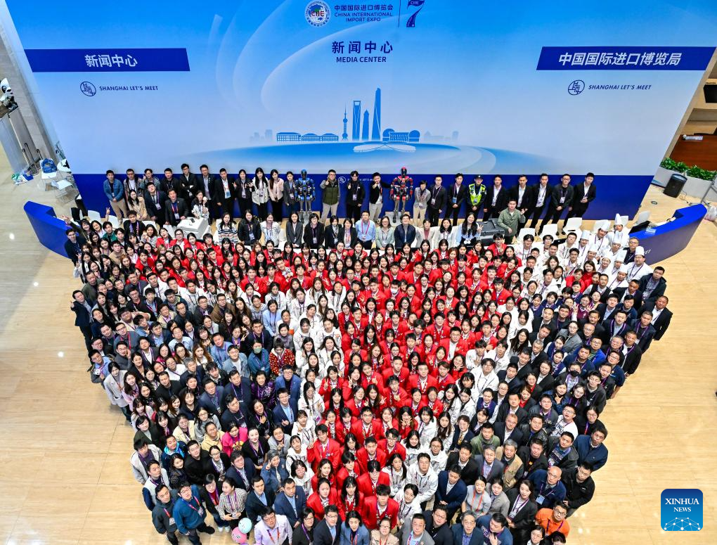 SHANGHAI, 10 noviembre, 2024 (Xinhua) -- Voluntarios y trabajadores de los medios de comunicación posan para fotografías en el centro de medios de la VII Exposición Internacional de Importaciones de China (CIIE, por sus siglas en inglés), en Shanghai, en el este de China, el 10 de noviembre de 2024. La VII CIIE concluyó aquí el domingo. (Xinhua/Zhang Cheng)