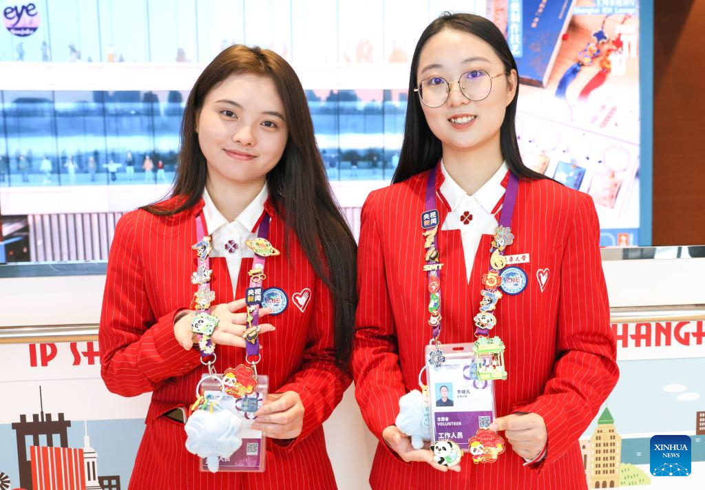 SHANGHAI, 10 noviembre, 2024 (Xinhua) -- Voluntarias exhiben su colección de insignias en la VII Exposición Internacional de Importaciones de China (CIIE, por sus siglas en inglés), en Shanghai, en el este de China, el 10 de noviembre de 2024. Para los empleados y voluntarios de la CIIE, coleccionar insignias no solo forma parte del placer de su trabajo, sino que también actúa como catalizador para fomentar la amistad y el entendimiento. (Xinhua/Yin Gang)