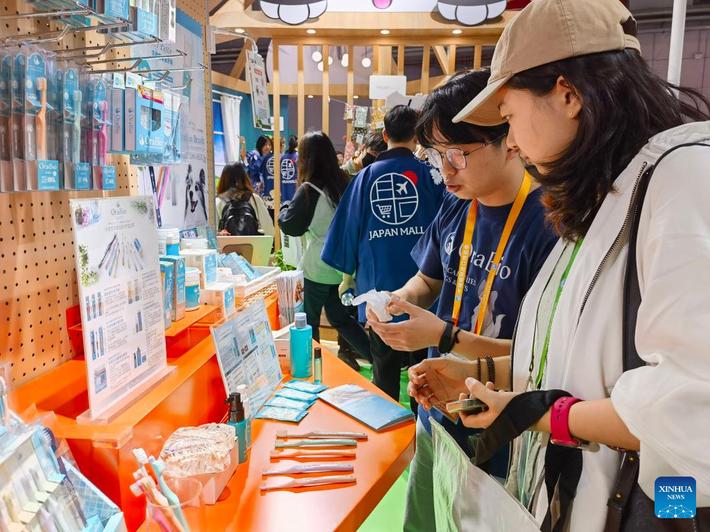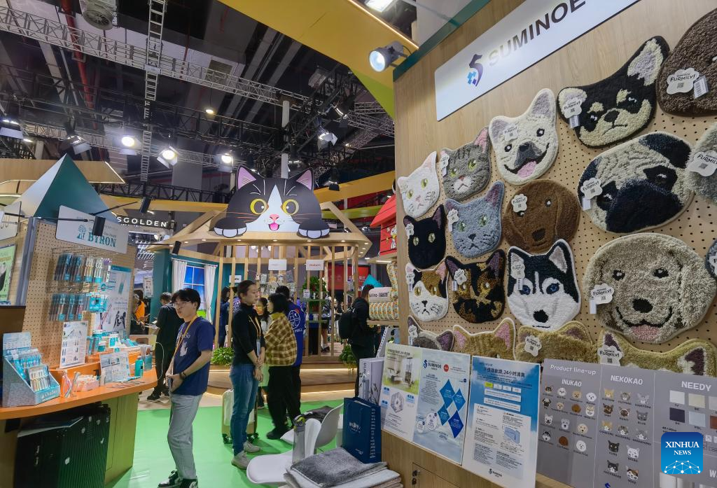 SHANGHAI, 11 noviembre, 2024 (Xinhua) -- Imagen del 6 de noviembre de 2024 de un expositor japonés (2-d) presentando productos de cuidado dental para mascotas a una visitante en el pabellón de mascotas de la VII Exposición Internacional de Importaciones de China (CIIE, por sus siglas en inglés), en Shanghai, este de China. En el área de exhibición de la VII CIIE, un gran pabellón de estilo japonés con dos llamativas mascotas gigantes de dibujos animados ha atraído la atención de muchos curiosos. (Xinhua/Chen Aiping)