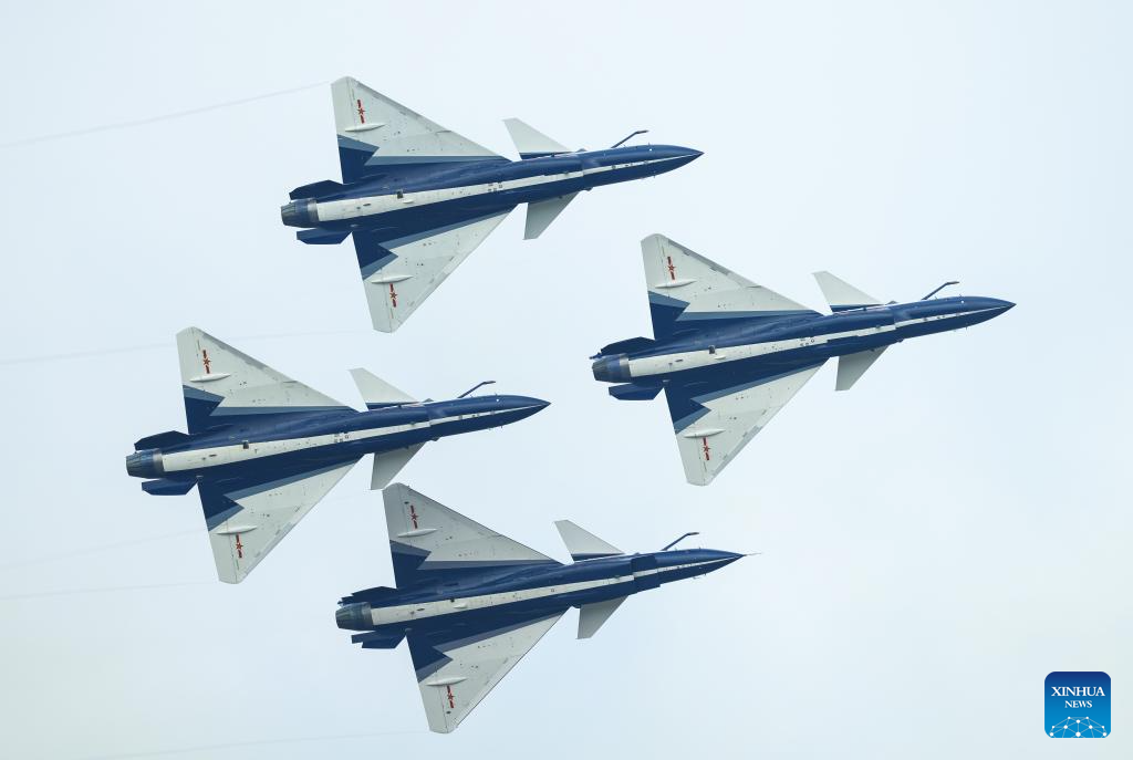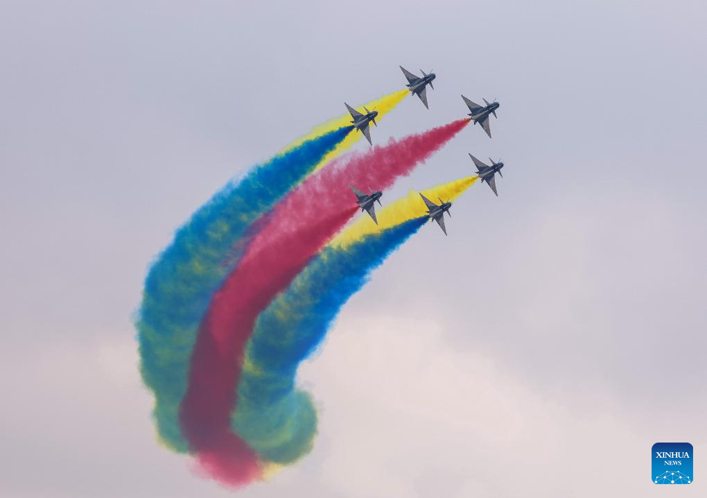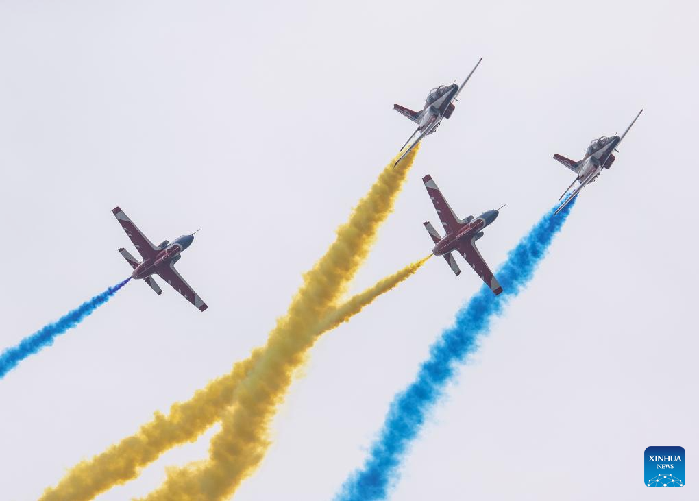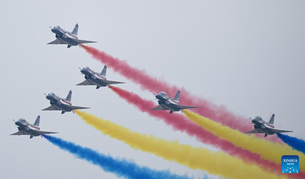 ZHUHAI, 11 noviembre, 2024 (Xinhua) -- Aviones del Equipo Acrobático Bayi de la Fuerza Aérea del Ejército Popular de Liberación de China realizan un entrenamiento de adaptación para el próximo Airshow China, en Zhuhai, en la provincia de Guangdong, en el sur de China, el 11 de noviembre de 2024. La XV Exposición Internacional Aeronáutica y Aeroespacial de China, también conocida como Airshow China, se celebrará en Zhuhai del 12 al 17 de noviembre. (Xinhua/Deng Hua)