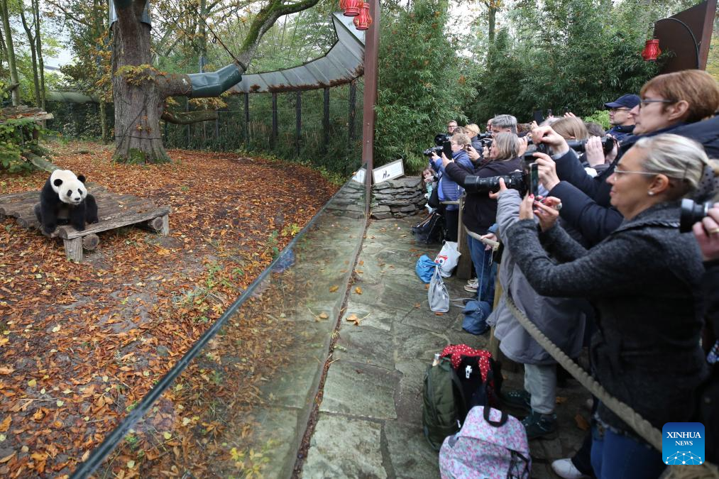 BRUGELETTE, 11 noviembre, 2024 (Xinhua) -- Imagen del 10 de noviembre de 2024 de personas tomando fotografías del panda gigante Tian Bao en el zoológico Pairi Daiza, en Brugelette, Bélgica. Personas despidieron el domingo al panda gigante Tian Bao y a los gemelos Bao Di y Bao Mei en el zoológico Pairi Daiza, ya que regresarán a China el 10 de diciembre. (Xinhua/Zhao Dingzhe)