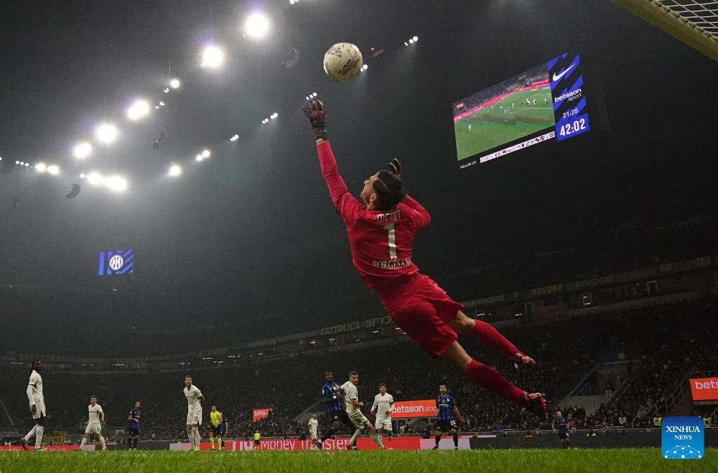 MILAN, 11 noviembre, 2024 (Xinhua) -- Imagen del 10 de noviembre de 2024 del guardameta Alex Meret, de Napoli, fallando una atajada para evitar la anotación de Hakan Calhanoglu, de Inter de Milán, durante el partido de fútbol de la Serie A entre Inter de Milán y Napoli, en Milán, Italia. (Xinhua/Alberto Lingria)