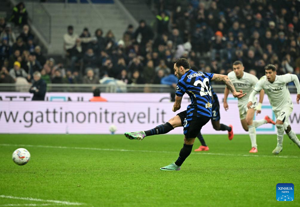 MILAN, 11 noviembre, 2024 (Xinhua) -- Imagen del 10 de noviembre de 2024 de Hakan Calhanoglu, de Inter de Milán, cobrando un penal durante el partido de fútbol de la Serie A entre Inter de Milán y Napoli, en Milán, Italia. (Xinhua/Alberto Lingria)