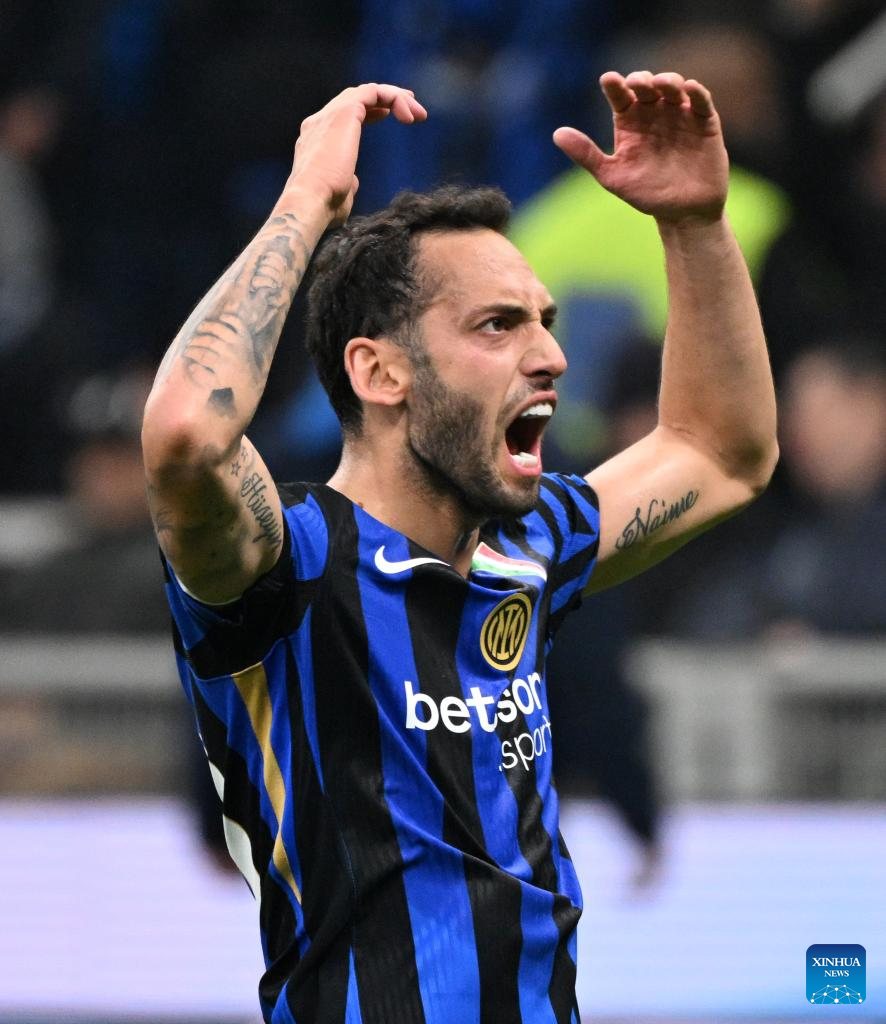 MILAN, 11 noviembre, 2024 (Xinhua) -- Imagen del 10 de noviembre de 2024 de Hakan Calhanoglu, de Inter de Milán, festejando su anotación durante el partido de fútbol de la Serie A entre Inter de Milán y Napoli, en Milán, Italia. (Xinhua/Alberto Lingria)