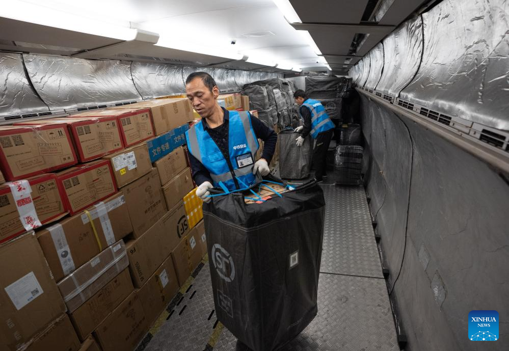CHENGDU, 11 noviembre, 2024 (Xinhua) -- Trabajadores descargan paquetes de comercio electrónico de un tren bala en la Estación de Ferrocarriles Oeste de Shuangliu, en Chengdu, en la provincia de Sichuan, en el suroeste de China, el 11 de noviembre de 2024. Los fabricantes, las plataformas de comercio electrónico y las compañías de logística de todo el país están ocupados atendiendo la demanda de los consumidores durante el festival anual de compras "Doble 11" de China. Del 4 al 11 de noviembre, el servicio exprés del ferrocarril de alta velocidad de la Estación de Ferrocarril Oeste de Shuangliu ha enviado cerca de 8.000 productos diarios, pesando más de 50 toneladas. Las principales categorías de bienes fueron, necesidades diarias, ropa y productos electrónicos, etcétera. (Xinhua/Jiang Hongjing)