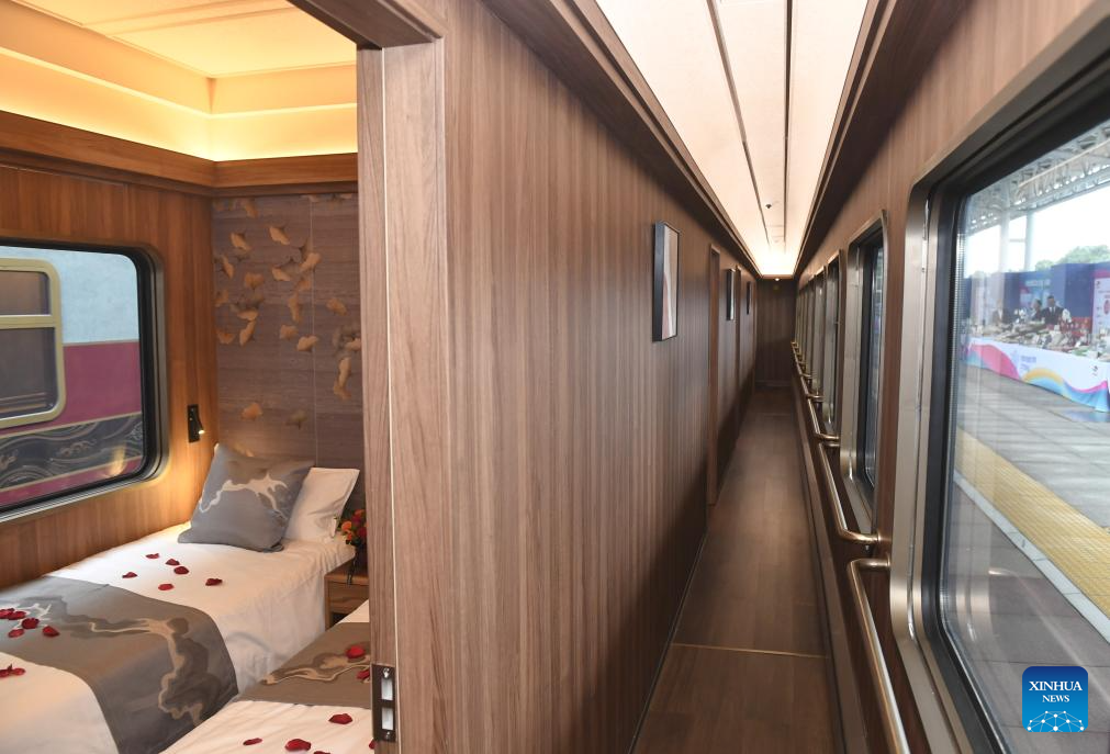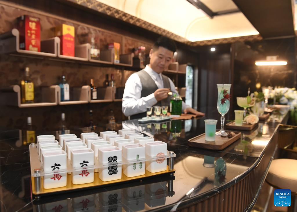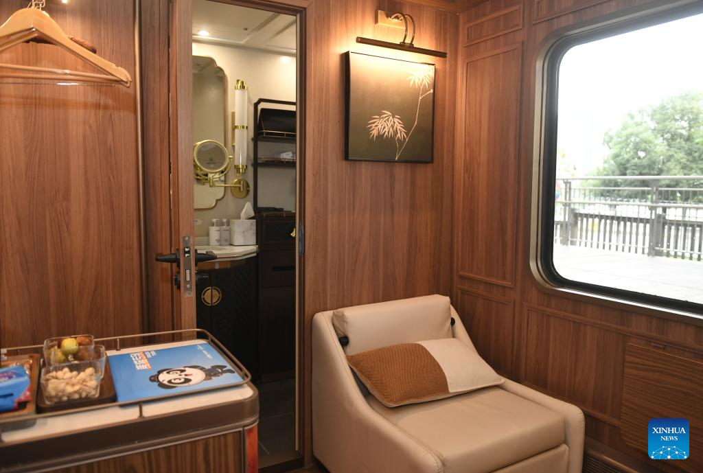 CHENGDU, 11 noviembre, 2024 (Xinhua) -- Imagen del 10 de noviembre de 2024 del restaurante de un tren turístico con temática de panda en la Estación de Ferrocarriles de Anjing, en Chengdu, en la provincia de Sichuan, en el suroeste de China. Un nuevo tren turístico con temática de pandas hizo su debut aquí el domingo. Operado por China Railway Chengdu Bureau Group, el tren panda es un tren turístico boutique de alta gama con servicios de alimentos, alojamiento y entretenimiento. (Xinhua/Liu Kun)