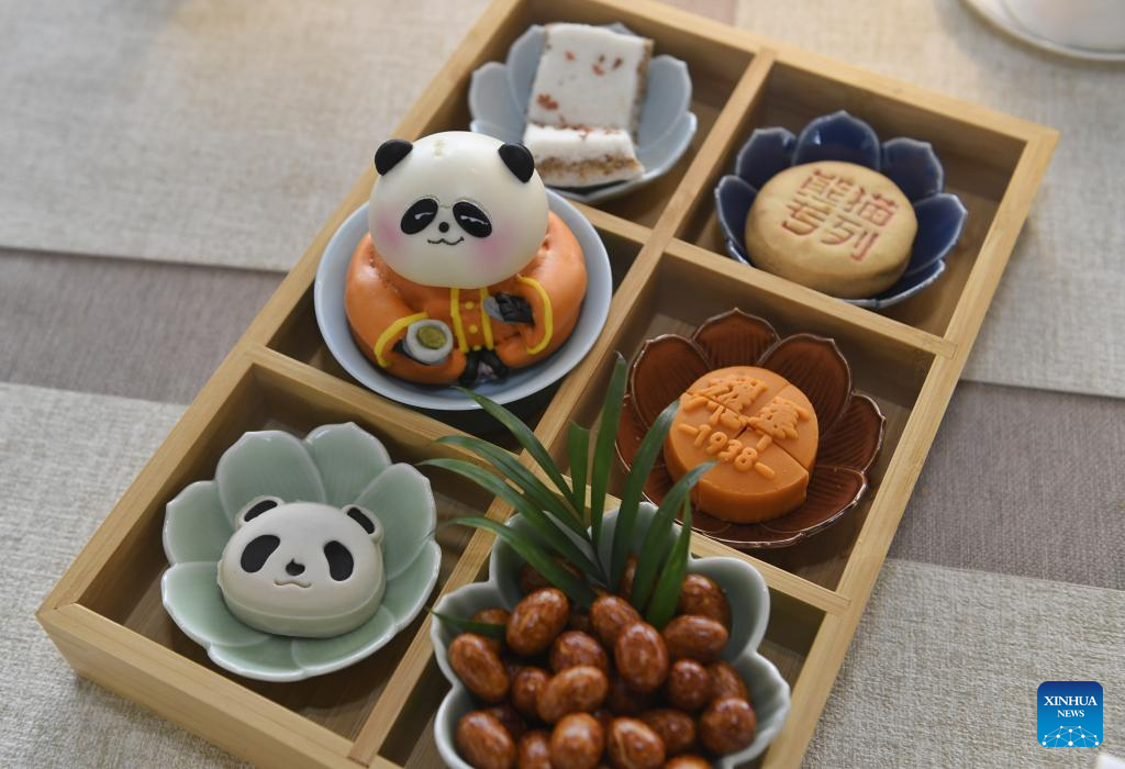CHENGDU, 11 noviembre, 2024 (Xinhua) -- Imagen del 10 de noviembre de 2024 de pasteles en el restaurante de un tren turístico con temática de pandas en la Estación de Ferrocarriles de Anjing, en Chengdu, en la provincia de Sichuan, en el suroeste de China. Un nuevo tren turístico con temática de pandas hizo su debut aquí el domingo. Operado por China Railway Chengdu Bureau Group, el tren panda es un tren turístico boutique de alta gama con servicios de alimentos, alojamiento y entretenimiento. (Xinhua/Liu Kun)
