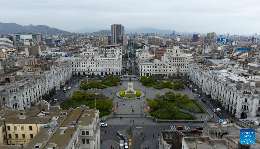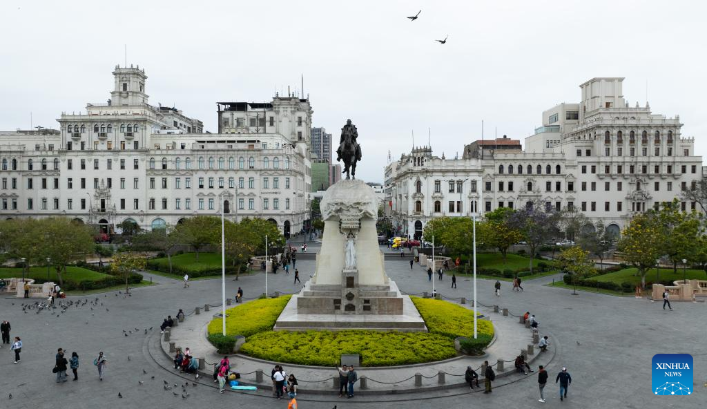 LIMA, 12 noviembre, 2024 (Xinhua) -- Imagen aérea tomada con un dron el 7 de noviembre de 2024 de una vista de la Plaza San Martín, en Lima, Perú. Lima, la capital y ciudad más grande de Perú, es el centro político, económico y cultural del país. Está compuesta por la sección histórica y la sección emergente, aunque la primera ha sido catalogada como patrimonio cultural de la humanidad gracias a los numerosos sitios de reliquias que allí se encuentran. (Xinhua/Li Mengxin)