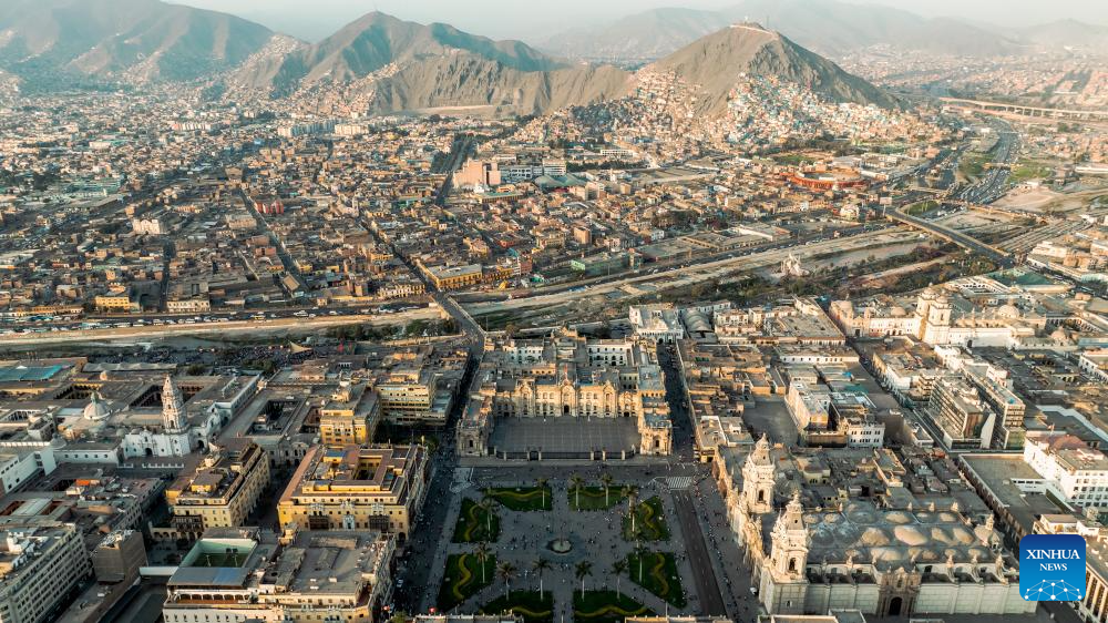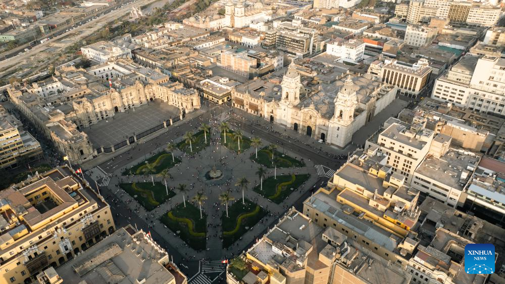 LIMA, 12 noviembre, 2024 (Xinhua) -- Imagen aérea tomada con un dron el 13 de octubre de 2024 de una vista de la Plaza de Armas, en Lima, Perú. Lima, la capital y ciudad más grande de Perú, es el centro político, económico y cultural del país. Está compuesta por la sección histórica y la sección emergente, aunque la primera ha sido catalogada como patrimonio cultural de la humanidad gracias a los numerosos sitios de reliquias que allí se encuentran. (Xinhua/Li Muzi)