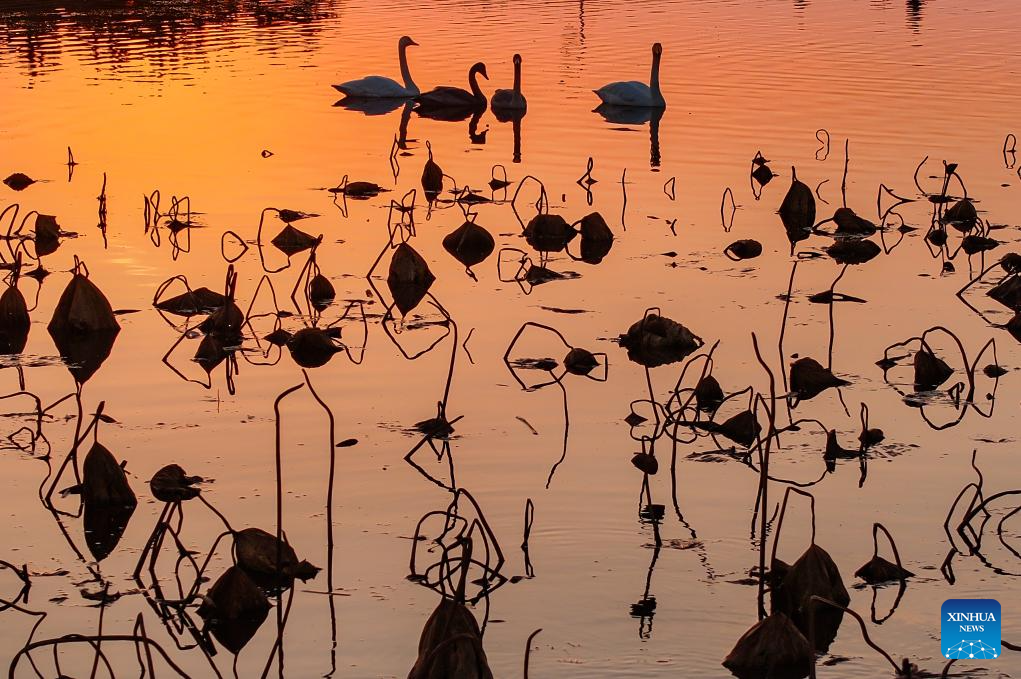 RONGCHENG, 13 noviembre, 2024 (Xinhua) -- Cisnes cantores son vistos en el poblado de Lidao de la ciudad de Rongcheng, en la provincia de Shandong, en el este de China, el 13 de noviembre de 2024. (Xinhua/Li Xinjun)