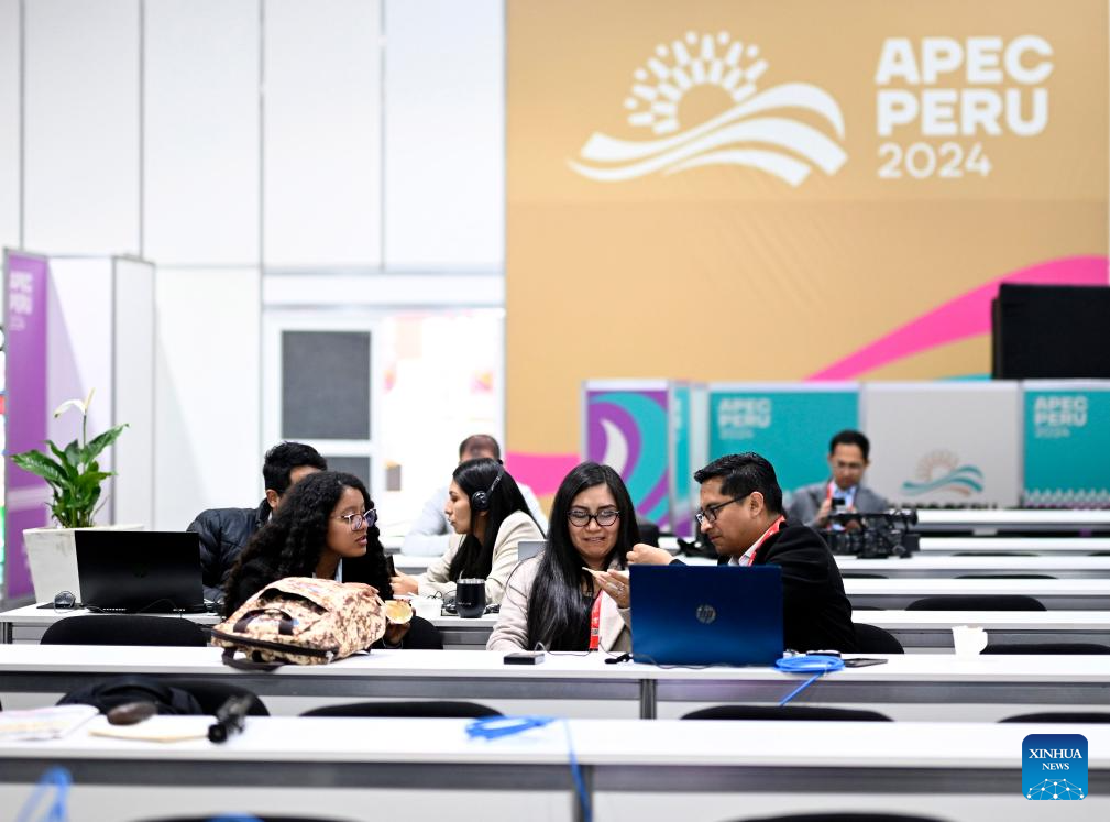 LIMA, 13 noviembre, 2024 (Xinhua) -- Imagen del 12 de noviembre de 2024 de periodistas vistos en el Centro Internacional de Prensa de APEC 2024, en Lima, Perú. La 31ª Reunión de Líderes Económicos de APEC se llevará a cabo en Lima. (Xinhua/Li Muzi)