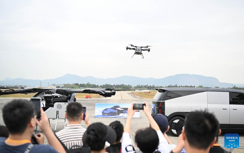 ZHUHAI, 14 noviembre, 2024 (Xinhua) -- Imagen del 10 de noviembre de 2024 del "Land Aircraft Carrier", un automóvil volador desarrollado por el fabricante de vehículos eléctricos chino XPENG, visto durante un vuelo en el Airshow China, en Zhuhai, en la provincia de Guangdong, en el sur de China. Un área de economía de baja altitud se instaló en la XV Exposición Internacional Aeronáutica y Aeroespacial de China, también conocida como Airshow China, mostrando productos y escenarios de aplicación relacionados. (Xinhua/Deng Hua)
