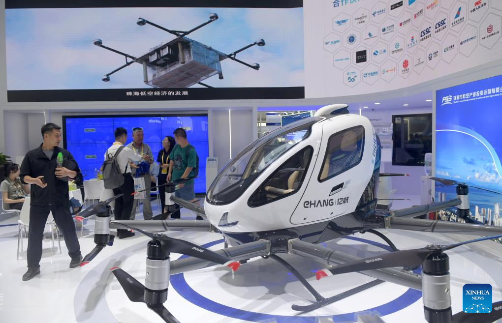 ZHUHAI, 14 noviembre, 2024 (Xinhua) -- Imagen del 13 de noviembre de 2024 de la aeronave de despegue y aterrizaje vertical eléctrico (eVTOL, por sus siglas en inglés) no tripulado EH216-S de EHang en el área de economía de baja altitud del Airshow China, en Zhuhai, en la provincia de Guangdong, en el sur de China. Un área de economía de baja altitud se instaló en la XV Exposición Internacional Aeronáutica y Aeroespacial de China, también conocida como Airshow China, mostrando productos y escenarios de aplicación relacionados. (Xinhua/Lu Hanxin)