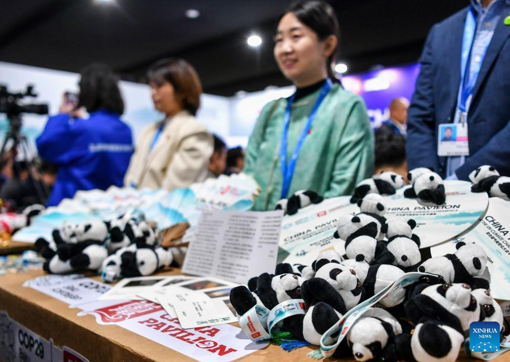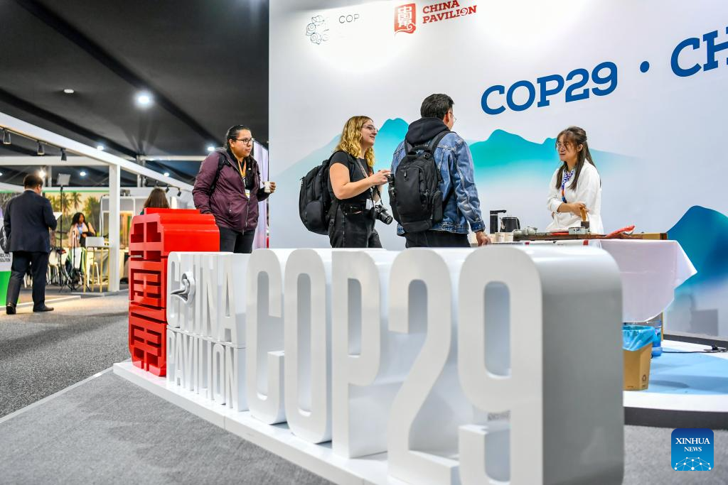 BAKU, 14 noviembre, 2024 (Xinhua) -- Imagen del 11 de noviembre de 2024 de una vista del Pabellón de China durante la 29ª sesión de la Conferencia de las Partes de la Convención Marco de las Naciones Unidas sobre el Cambio Climático (COP29), en Bakú, Azerbaiyán. Diversos productos y servicios con elementos chinos han llamado la atención de los participantes en la COP29. (Xinhua/Cao Yang)