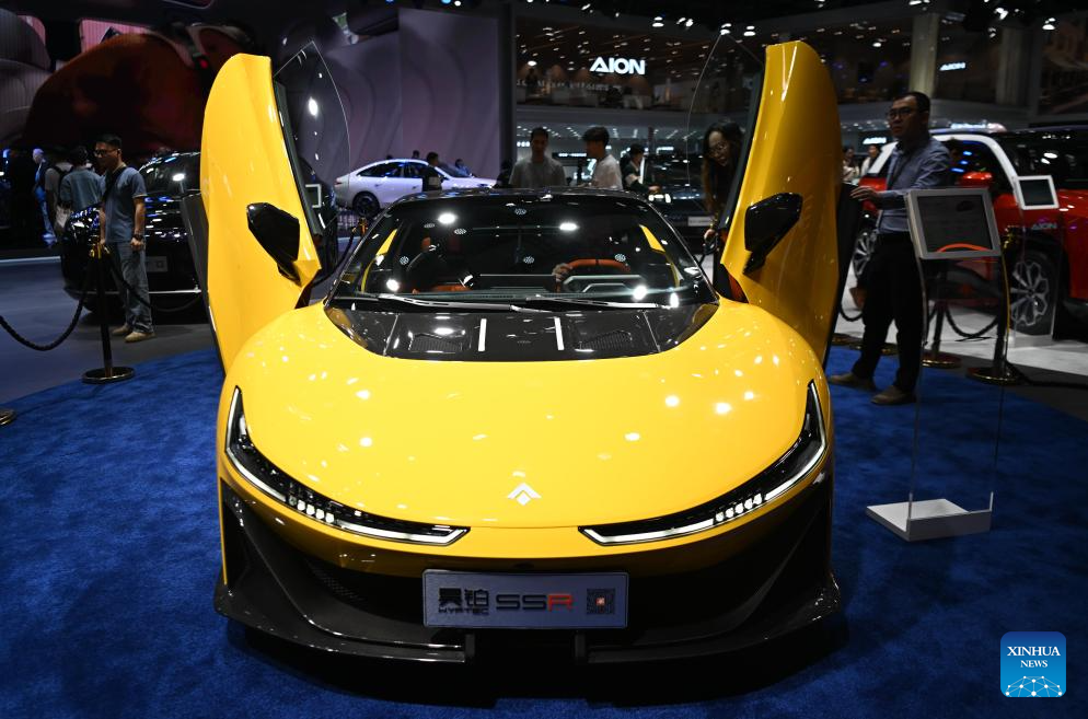 GUANGZHOU, 15 noviembre, 2024 (Xinhua) -- Imagen del 15 de noviembre de 2024 de un Hyper SSR de GAC Aion en la 22 Exposición Internacional del Automóvil de Guangzhou en el Complejo de la Feria de Importaciones y Exportaciones de China, en Guangzhou, en la provincia de Guangdong, en el sur de China. La exposición fue inaugurada aquí el viernes, en la que los vehículos de nuevas energías han llamado la atención ampliamente. (Xinhua/Deng Hua)