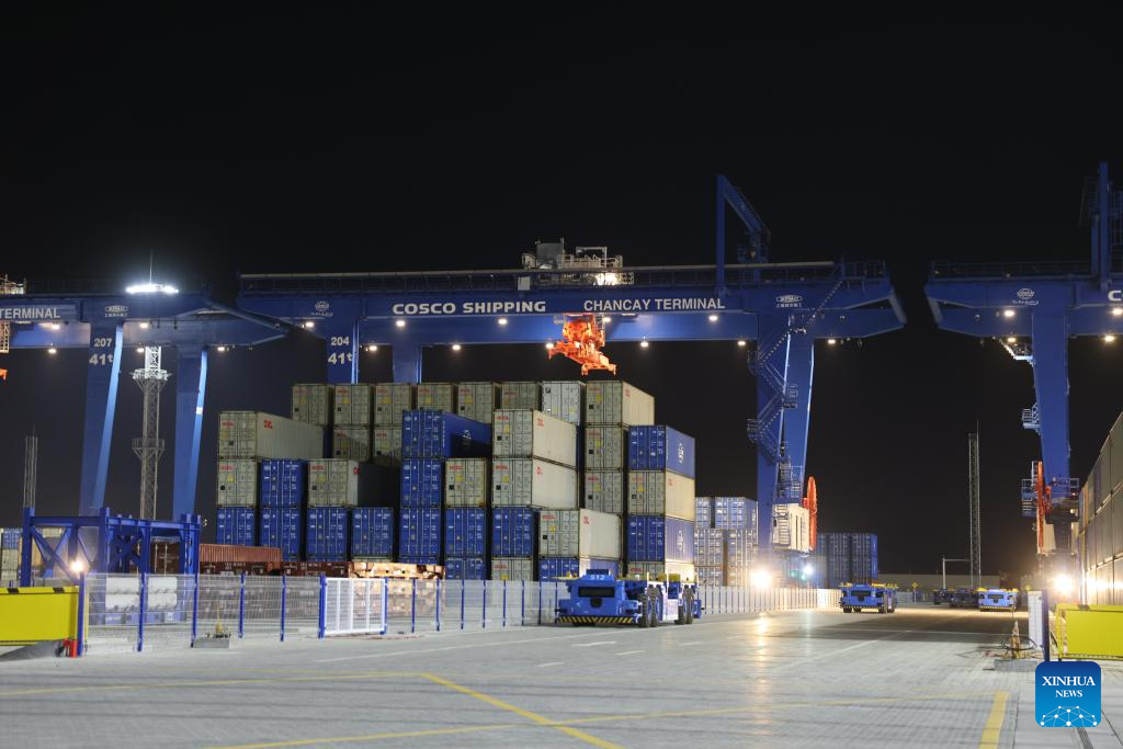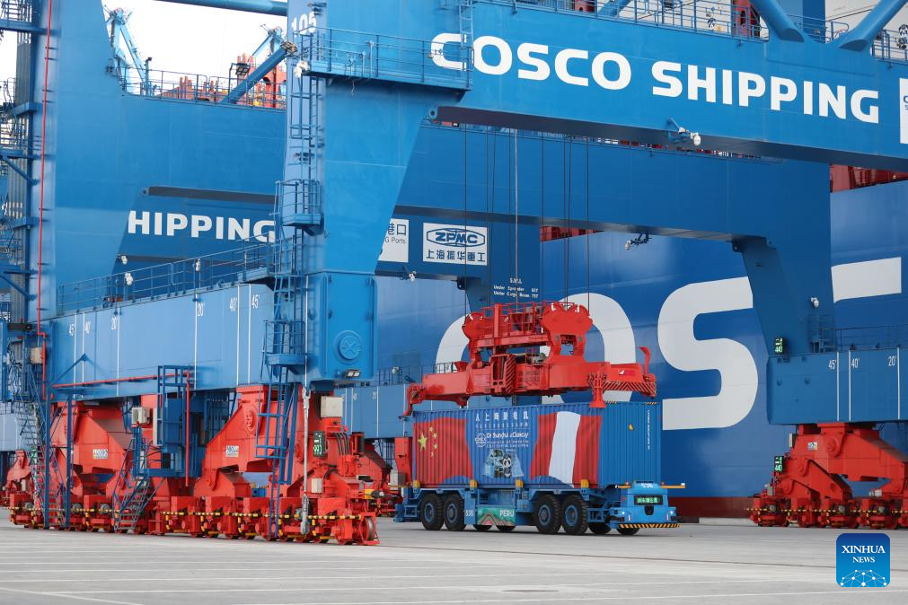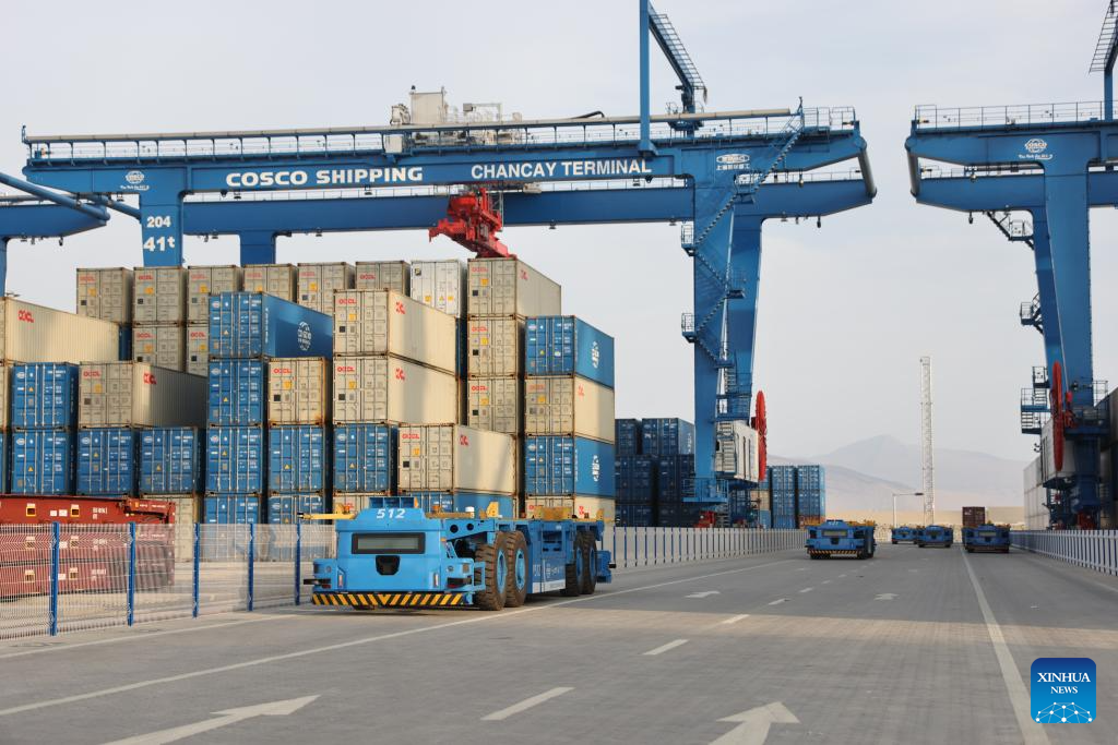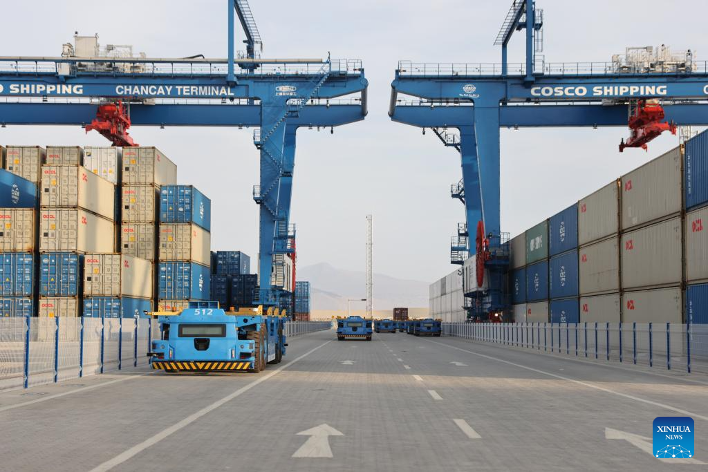 CHANCAY, 15 noviembre, 2024 (Xinhua) -- Imagen del 14 de noviembre de 2024 de una vista del puerto de Chancay, en Perú. La ceremonia de inauguración del puerto de Chancay se llevó a cabo el 14 de noviembre, hora local. El puerto de Chancay no solo es un proyecto importante en el marco de la cooperación de la Franja y la Ruta, sino también el primer puerto inteligente y ecológico de América del Sur. La primera fase del proyecto, cuando esté terminada, reducirá el tiempo de transporte marítimo desde Perú hasta China a 23 días, lo que reducirá los costos logísticos en al menos un 20 por ciento. (Xinhua/Li Mengxin)
