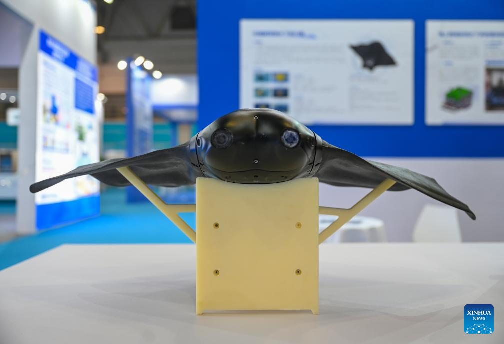 FUZHOU, 15 noviembre, 2024 (Xinhua) -- Imagen del 15 de noviembre de 2024 de un vehículo submarino inteligente con la forma de una manta raya en la Conferencia Mundial de Equipos Marítimos 2024, en Fuzhou, en la provincia de Fujian, en el sureste de China. Expertos mundiales en el equipamiento para el mar y representantes de reconocidas empresas y organizaciones de la industria asistieron a la Conferencia Mundial de Equipos Marítimos 2024, que se inauguró el viernes en la ciudad oriental china de Fuzhou. La innovación tecnológica, la fabricación de equipos, la cooperación industrial y otros temas serán discutidos durante el evento de cuatro días de duración, según el organizador. (Xinhua/Zhou Yi)