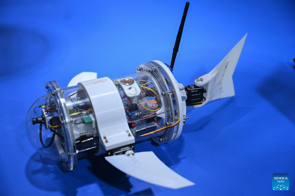 FUZHOU, 15 noviembre, 2024 (Xinhua) -- Imagen del 15 de noviembre de 2024 de un pez robot exhibido en la Conferencia Mundial de Equipos Marítimos 2024, en Fuzhou, en la provincia de Fujian, en el sureste de China. Expertos mundiales en el equipamiento para el mar y representantes de reconocidas empresas y organizaciones de la industria asistieron a la Conferencia Mundial de Equipos Marítimos 2024, que se inauguró el viernes en la ciudad oriental china de Fuzhou. La innovación tecnológica, la fabricación de equipos, la cooperación industrial y otros temas serán discutidos durante el evento de cuatro días de duración, según el organizador. (Xinhua/Zhou Yi)