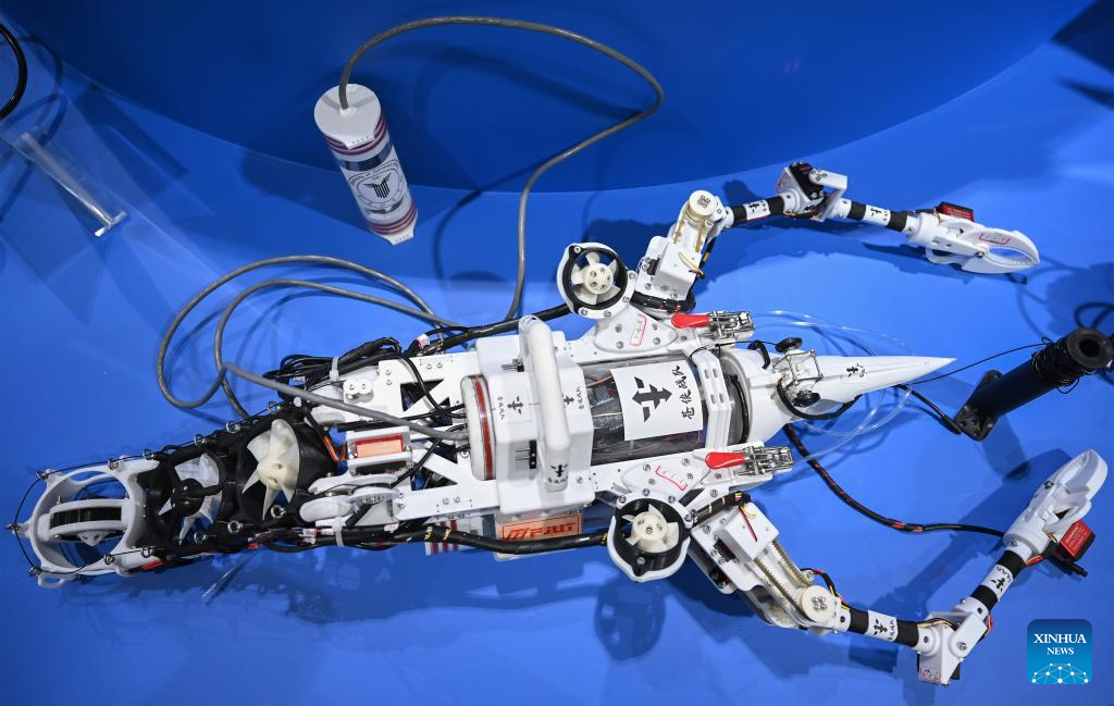 FUZHOU, 15 noviembre, 2024 (Xinhua) -- Imagen del 15 de noviembre de 2024 de un robot sumergible civil biónico exhibido en la Conferencia Mundial de Equipos Marítimos 2024, en Fuzhou, en la provincia de Fujian, en el sureste de China. Expertos mundiales en el equipamiento para el mar y representantes de reconocidas empresas y organizaciones de la industria asistieron a la Conferencia Mundial de Equipos Marítimos 2024, que se inauguró el viernes en la ciudad oriental china de Fuzhou. La innovación tecnológica, la fabricación de equipos, la cooperación industrial y otros temas serán discutidos durante el evento de cuatro días de duración, según el organizador. (Xinhua/Zhou Yi)