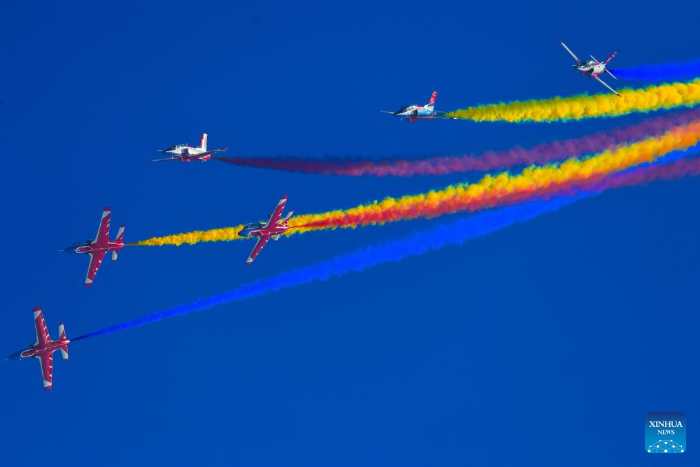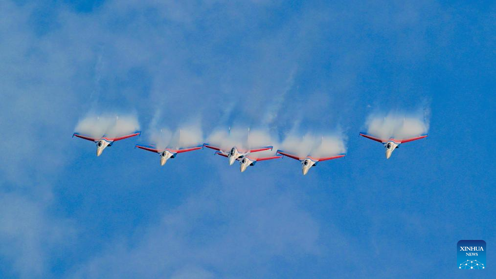 ZHUHAI, 17 noviembre, 2024 (Xinhua) -- Imagen del 8 de noviembre de 2024 de aviones del Equipo Acrobático Halcón Rojo de China realizando un entrenamiento de adaptación, en Zhuhai, en la provincia de Guangdong, en el sur de China. La XV Exposición Internacional Aeronáutica y Aeroespacial de China, también conocida como Airshow China, se celebró en Zhuhai del 12 al 17 de noviembre. (Xinhua/Xu Yang)