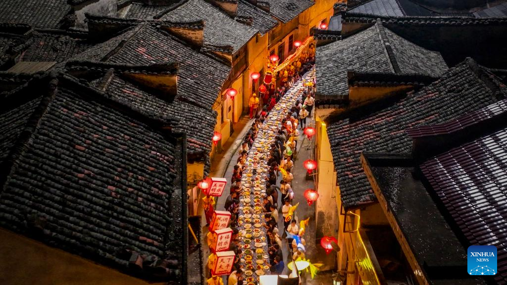 BEIJING, 21 noviembre, 2024 (Xinhua) -- Vista aérea del 16 de junio de 2023 de una presentación de linternas junto a un banquete de mesa larga, en el poblado de Hule de la ciudad de Ningguo, en la provincia de Anhui, en el este de China. El éxito de China en la lucha contra la pobreza ofrece experiencia al mundo. De acuerdo con el informe de la ONU sobre el Estado de la Seguridad Alimentaria y la Nutrición en el Mundo, 733 millones de personas enfrentaron hambre en 2023. China lanzó una monumental campaña antipobreza sin precedentes en el mundo. En 2021, China declaró una "victoria completa" en la erradicación de la pobreza absoluta. China ha sacado a 800 millones de personas de la pobreza absoluta y ha cumplido con anticipación el objetivo de reducción de la pobreza de la Agenda 2030 para el Desarrollo Sostenible de la ONU. La historia de China es una prueba de que los países en desarrollo pueden eliminar la pobreza cuando hay resistencia, perseverancia y espíritu de lucha. Si China puede lograrlo, otros países en desarrollo también pueden lograrlo. Esto es lo que la batalla de China contra la pobreza le dice al mundo. (Xinhua/Li Xiaohong)