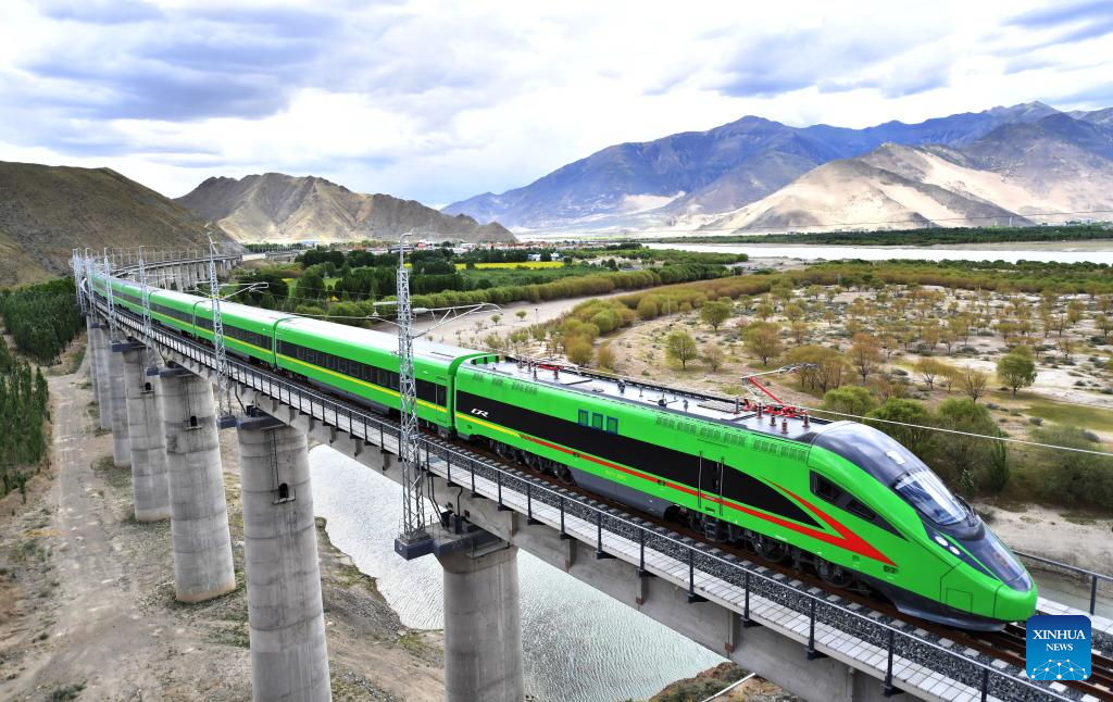 BEIJING, 21 noviembre, 2024 (Xinhua) -- Vista aérea del 16 de junio de 2021 de un tren bala Fuxing circulando por la vía férrea Lhasa-Nyingchi durante una operación de prueba en Shannan, en la región autónoma del Tíbet, en el suroeste de China. El éxito de China en la lucha contra la pobreza ofrece experiencia al mundo. De acuerdo con el informe de la ONU sobre el Estado de la Seguridad Alimentaria y la Nutrición en el Mundo, 733 millones de personas enfrentaron hambre en 2023. China lanzó una monumental campaña antipobreza sin precedentes en el mundo. En 2021, China declaró una "victoria completa" en la erradicación de la pobreza absoluta. China ha sacado a 800 millones de personas de la pobreza absoluta y ha cumplido con anticipación el objetivo de reducción de la pobreza de la Agenda 2030 para el Desarrollo Sostenible de la ONU. La historia de China es una prueba de que los países en desarrollo pueden eliminar la pobreza cuando hay resistencia, perseverancia y espíritu de lucha. Si China puede lograrlo, otros países en desarrollo también pueden lograrlo. Esto es lo que la batalla de China contra la pobreza le dice al mundo. (Xinhua/Chogo)