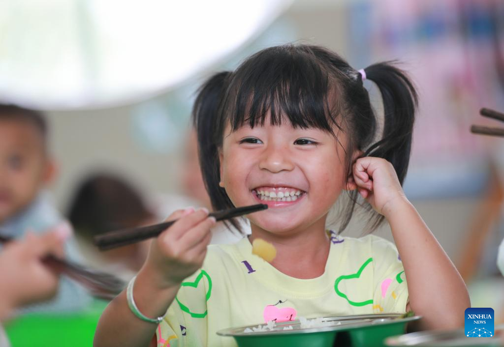 BEIJING, 21 noviembre, 2024 (Xinhua) -- Imagen del 15 de septiembre de 2023 de una niña comiendo un almuerzo nutritivo gratuito en el jardín de niños central, en la aldea de Gangbian del distrito de Congjiang, en la provincia de Guizhou, en el suroeste de China. El éxito de China en la lucha contra la pobreza ofrece experiencia al mundo. De acuerdo con el informe de la ONU sobre el Estado de la Seguridad Alimentaria y la Nutrición en el Mundo, 733 millones de personas enfrentaron hambre en 2023. China lanzó una monumental campaña antipobreza sin precedentes en el mundo. En 2021, China declaró una "victoria completa" en la erradicación de la pobreza absoluta. China ha sacado a 800 millones de personas de la pobreza absoluta y ha cumplido con anticipación el objetivo de reducción de la pobreza de la Agenda 2030 para el Desarrollo Sostenible de la ONU. La historia de China es una prueba de que los países en desarrollo pueden eliminar la pobreza cuando hay resistencia, perseverancia y espíritu de lucha. Si China puede lograrlo, otros países en desarrollo también pueden lograrlo. Esto es lo que la batalla de China contra la pobreza le dice al mundo. (Xinhua/Luo Jinglai)