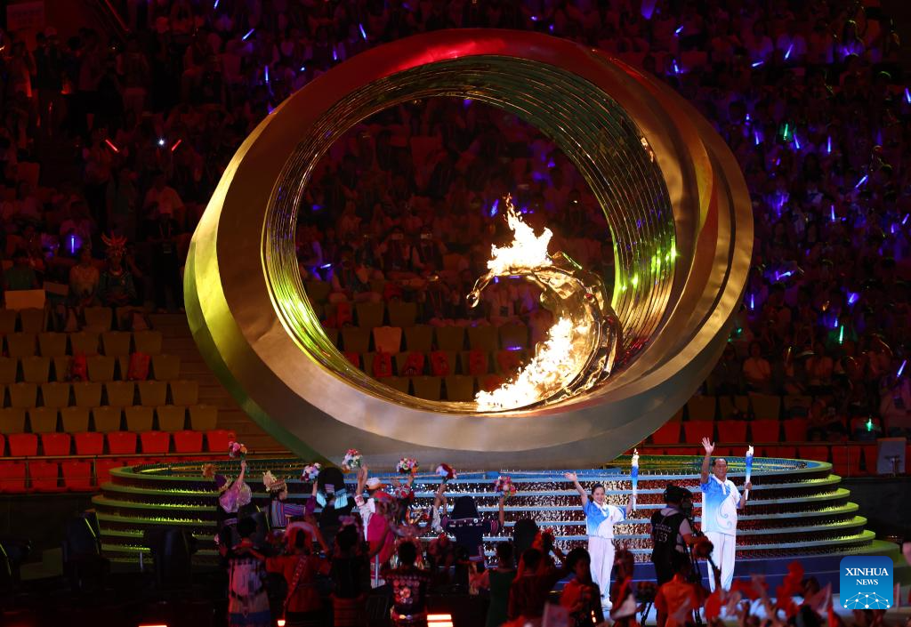 SANYA, 22 noviembre, 2024 (Xinhua) -- El pebetero es encendido durante la ceremonia de inauguración de los XII Juegos Tradicionales Nacionales de Minorías Etnicas de la República Popular China, en Sanya, en la provincia de Hainan, en el sur de China, el 22 de noviembre de 2024. (Xinhua/Yang Zhisen)