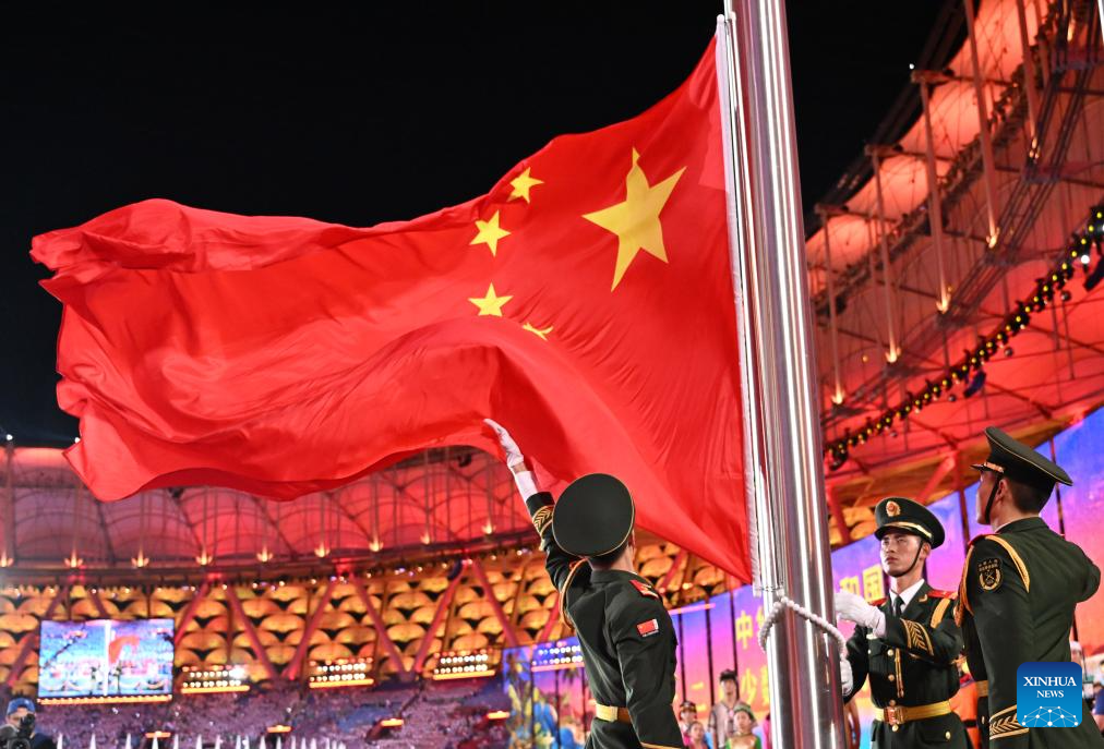 SANYA, 22 noviembre, 2024 (Xinhua) -- La bandera nacional china es izada durante la ceremonia de inauguración de los XII Juegos Tradicionales Nacionales de Minorías Etnicas de la República Popular China, en Sanya, en la provincia de Hainan, en el sur de China, el 22 de noviembre de 2024. (Xinhua/Sun Fanyue)
