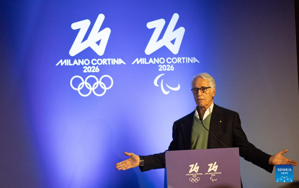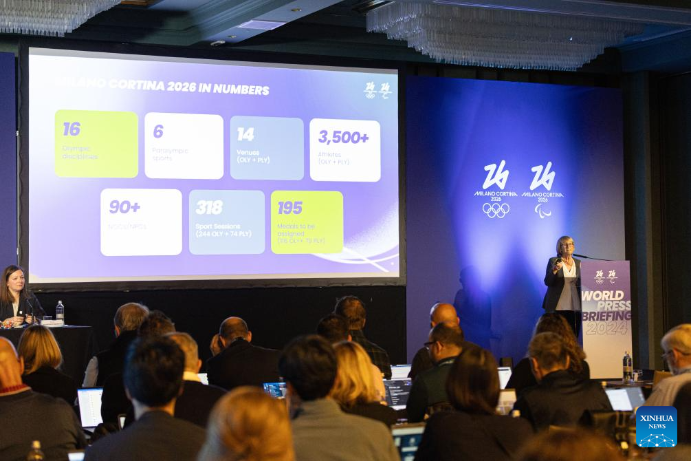 MILAN, 22 noviembre, 2024 (Xinhua) -- Imagen del 21 de noviembre de 2024 del presidente de Milano Cortina 2026, Giovanni Malago, hablando durante la Conferencia de Prensa Mundial de los Juegos Olímpicos y Paralímpicos de Invierno de Milán Cortina 2026, en Milán, Italia. (Xinhua/Li Jing)