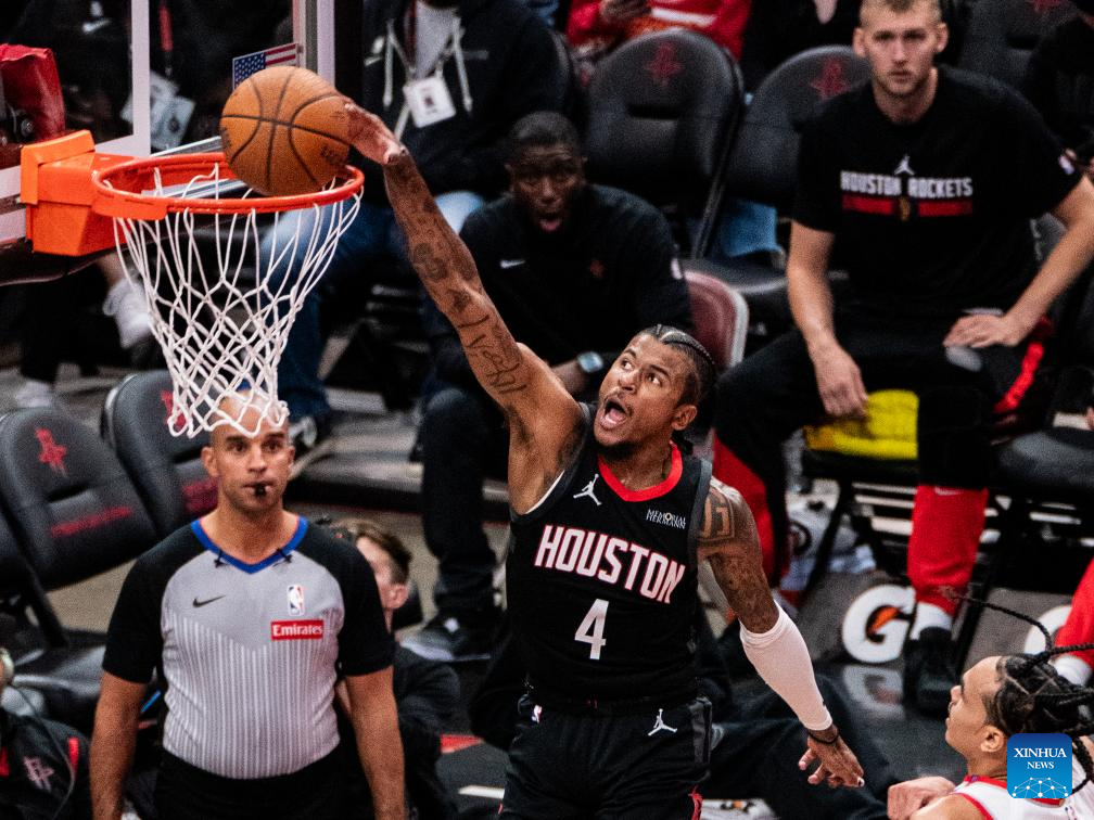 HOUSTON, 23 noviembre, 2024 (Xinhua) -- Imagen del 22 de noviembre de 2024 de Jalen Green, de Houston Rockets, clavando el balón durante el partido de la fase de grupos de la Copa NBA 2024-2025 entre Portland Trail Blazers y Houston Rockets, en Houston, Texas, Estados Unidos. (Xinhua/Chen Chen)