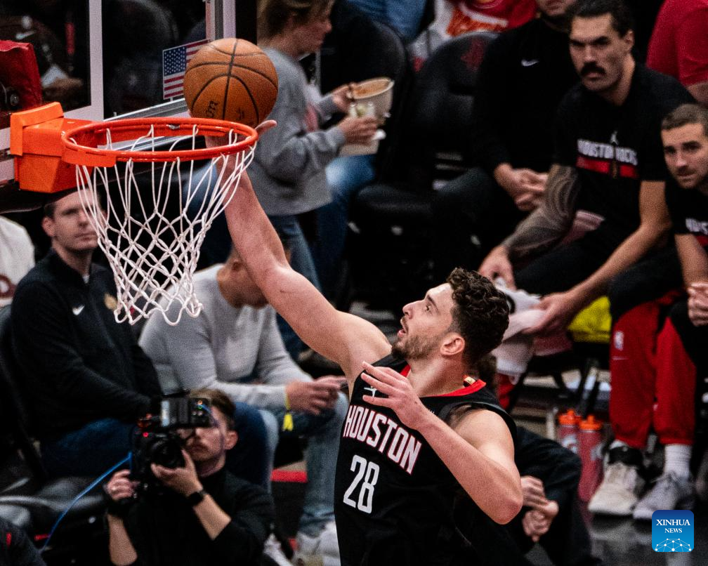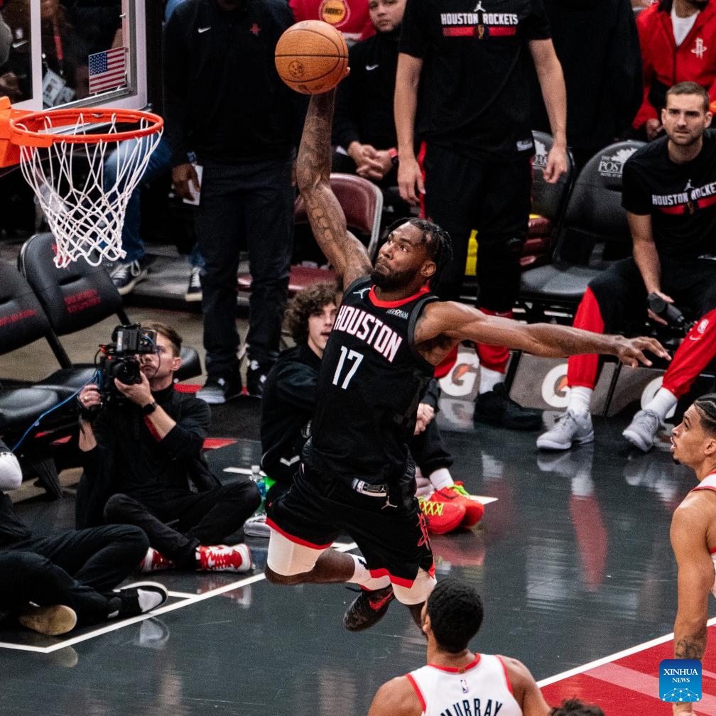 HOUSTON, 23 noviembre, 2024 (Xinhua) -- Imagen del 22 de noviembre de 2024 de Tari Eason, de Houston Rockets, clavando el balón durante el partido de la fase de grupos de la Copa NBA 2024-2025 entre Portland Trail Blazers y Houston Rockets, en Houston, Texas, Estados Unidos. (Xinhua/Chen Chen)