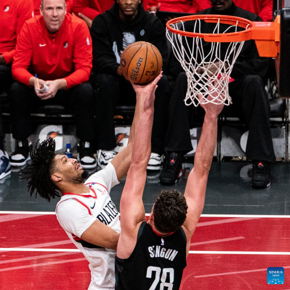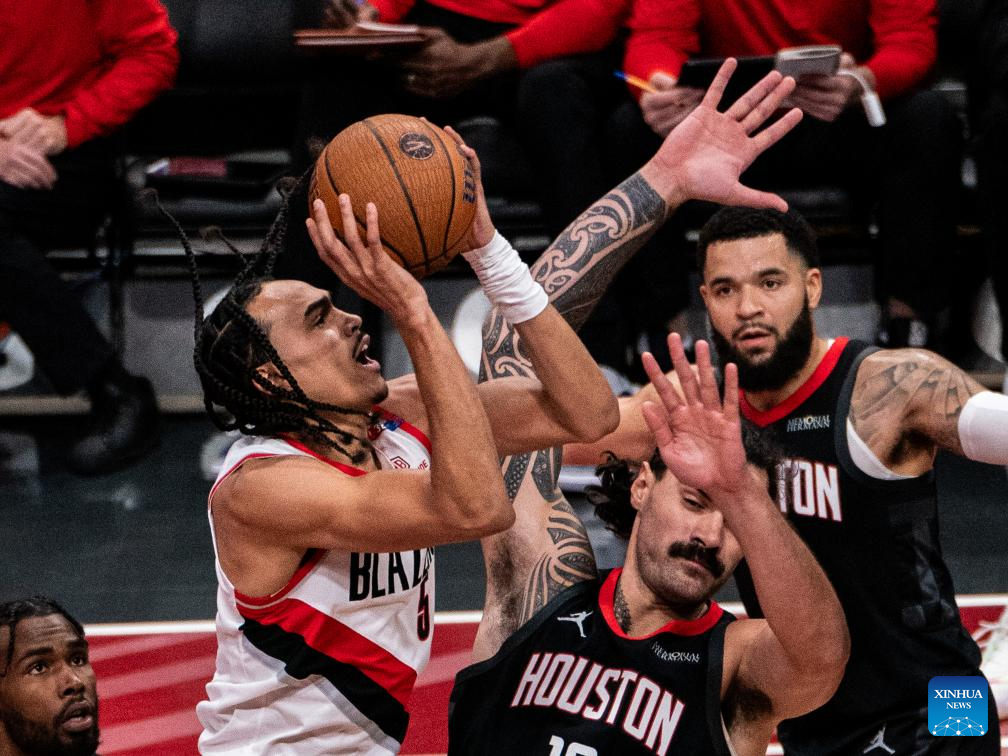 HOUSTON, 23 noviembre, 2024 (Xinhua) -- Imagen del 22 de noviembre de 2024 de Dalano Banton (i-arriba), de Portland Trail Blazers, intentando anotar durante el partido de la fase de grupos de la Copa NBA 2024-2025 entre Portland Trail Blazers y Houston Rockets, en Houston, Texas, Estados Unidos. (Xinhua/Chen Chen)