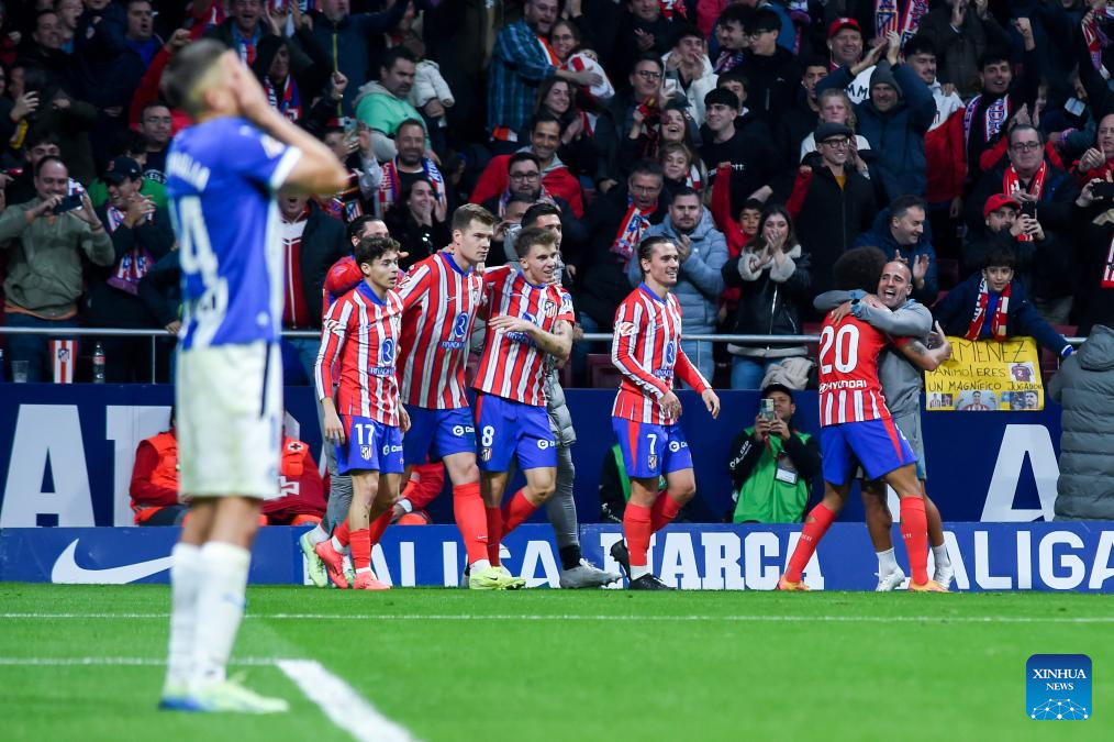 MADRID, 24 noviembre, 2024 (Xinhua) -- Imagen del 23 de noviembre de 2024 de Alexander Sorloth (4-i), de Atlético de Madrid, festejando su anotación durante el partido de fútbol de LaLiga, entre Atlético de Madrid y Deportivo Alavés, en el Estadio Civitas Metropolitano, en Madrid, España. (Xinhua/Gustavo Valiente)