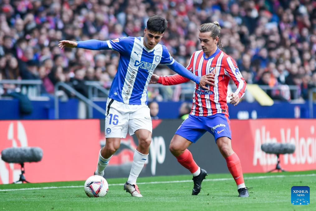 MADRID, 24 noviembre, 2024 (Xinhua) -- Imagen del 23 de noviembre de 2024 de Antoine Griezmann (d), de Atlético de Madrid, disputando el balón con Carlos Martín, de Deportivo Alavés, durante el partido de fútbol de LaLiga, entre Atlético de Madrid y Deportivo Alavés, en el Estadio Civitas Metropolitano, en Madrid, España. (Xinhua/Gustavo Valiente)