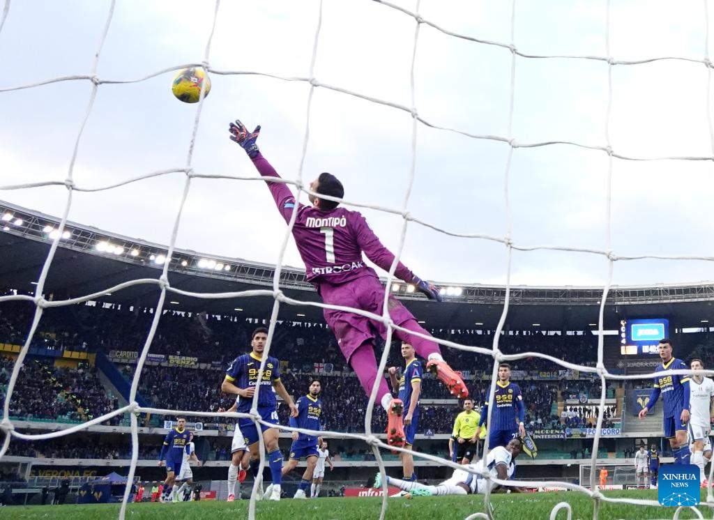VERONA, 24 noviembre, 2024 (Xinhua) -- Imagen del 23 de noviembre de 2024 del guardameta Lorenzo Montipo (frente), de Hellas Verona, fallando al atajar la anotación de Yann Bisseck (abajo), de Inter de Milán, durante el partido de fútbol de la Serie A entre Hellas Verona e Inter de Milán, en Verona, Italia. (Xinhua/Augusto Casasoli)