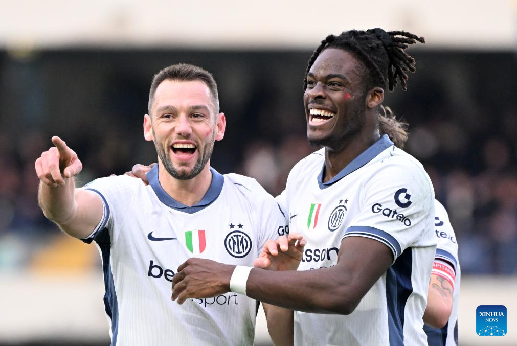 VERONA, 24 noviembre, 2024 (Xinhua) -- Imagen del 23 de noviembre de 2024 de Stefan De Vrij (i), de Inter de Milán, festejando su anotación con su compañero Yann Bisseck, durante el partido de fútbol de la Serie A entre Hellas Verona e Inter de Milán, en Verona, Italia. (Xinhua/Augusto Casasoli)